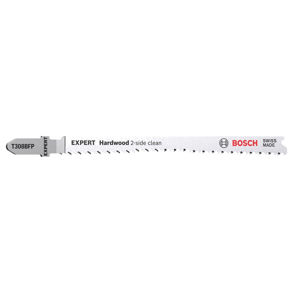 EXPERT HARDWOOD 2-SIDE CLEAN T308BFP ZAAGBLADEN VOOR DECOUPEERZAGEN Hoogtepunten van het productErvoor zorgen dat de 'schone kant' van een decoupeerzaag op het zichtbare deel van het werkmateriaal zit, is altijd een kunst geweest voor schrijnwerkers en houtbewerkers. Soms kun je het werkstuk omdraaien en soms kan de decoupeerzaag zelf ondersteboven worden gehouden. Of je kunt de EXPERT 'Hardwood 2-side clean' gebruiken, die aan beide kanten perfect splintervrij zaagt dankzij de in tegengestelde hoeken gerangschikte tanden. Het Bosch EXPERT 'Hardwood 2-side clean' decoupeerzaagblad is gemaakt van bi-metaal, een strook sneldraaistaal die met een flexibel stalen zaagblad is verbonden om kracht en flexibiliteit te combineren, en is sterk genoeg om keukenbladen van gelamineerde spaanplaat of hardhout te zagen. Beschikbaar voor splintervrije rechte zaagsneden (T308BF) en voor bijzonder nauwkeurige splintervrije hoekzaagsneden (T308BFP)