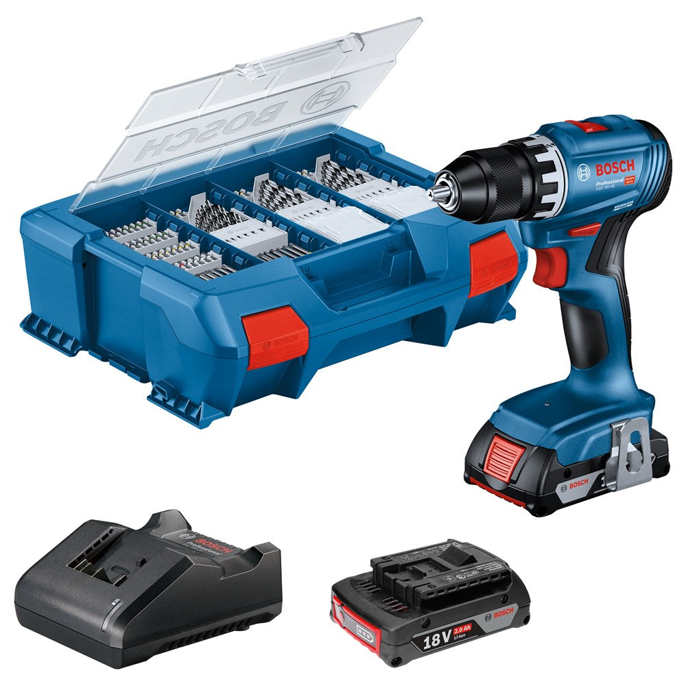GSR 18V-45 borstelloze schroefboormachine (45Nm), 2×2,0Ah accu, GAL 18V-20 lader, 82-delige set en L-Case.