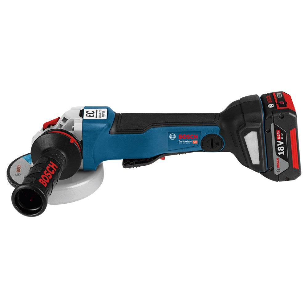 GWS 18V-10 PC PROFESSIONAL Hoogtepunten van het productDe kleine haakse accuslijpmachine GWS 18V-10 PC Professional biedt een verbeterd vermogensniveau en machinecontrole in de 18V-klasse. Deze levert vermogen dat overeenkomt met een 1000 W slijpmachine met snoer dankzij de borstelloze motor en ProCORE18V-accutechnologie. Uitgerust met KickBack Control en intelligent remsysteem biedt deze kleine haakse slijpmachine een hoger niveau van gebruikersbescherming en groter comfort. Deze heeft ook een PROtection switch (veiligheidsschakelaar) die de slijpmachine direct uitschakelt, wanneer deze wordt losgelaten voor verdere maximale gebruikersbescherming. Deze machine is bestemd voor het (door)slijpen van metaal, steen en beton. Deze is compatibel met stofafzuighulpstukken GDE 125 EA-T Professional en GDE 115 / 125 FC-T Professional, en Bluetooth-module GCY 30-4 evenals alle Bosch Professional 18V-accu's en opladers (Professional 18V System).