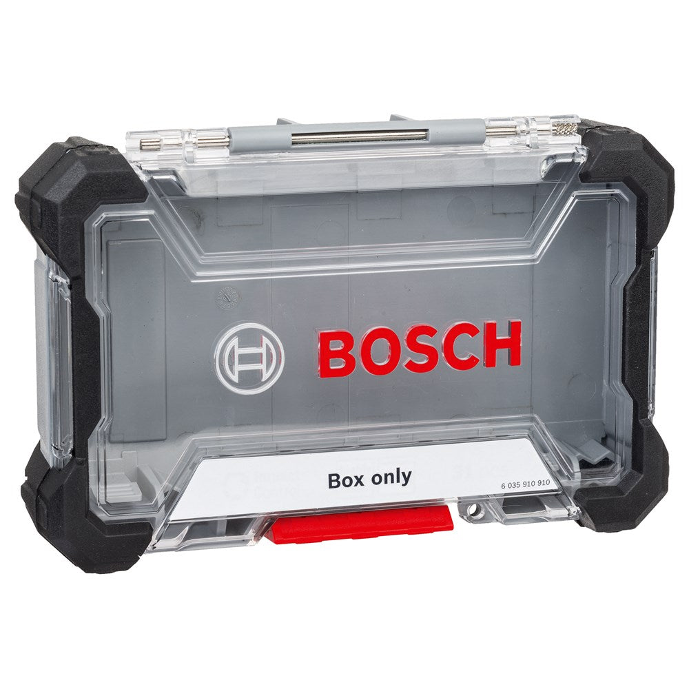 Deze koffer maakt deel uit van het Bosch Pick and Click systeem, waarmee individueel samen te stellen accessoiresets voor volledig aanpasbare bitsets mogelijk zijn. In de sleuven met klikvergrendeling kan een gepersonaliseerde verzameling individueel gekochte packs worden geplaatst en oude packs eenvoudig worden vervangen.