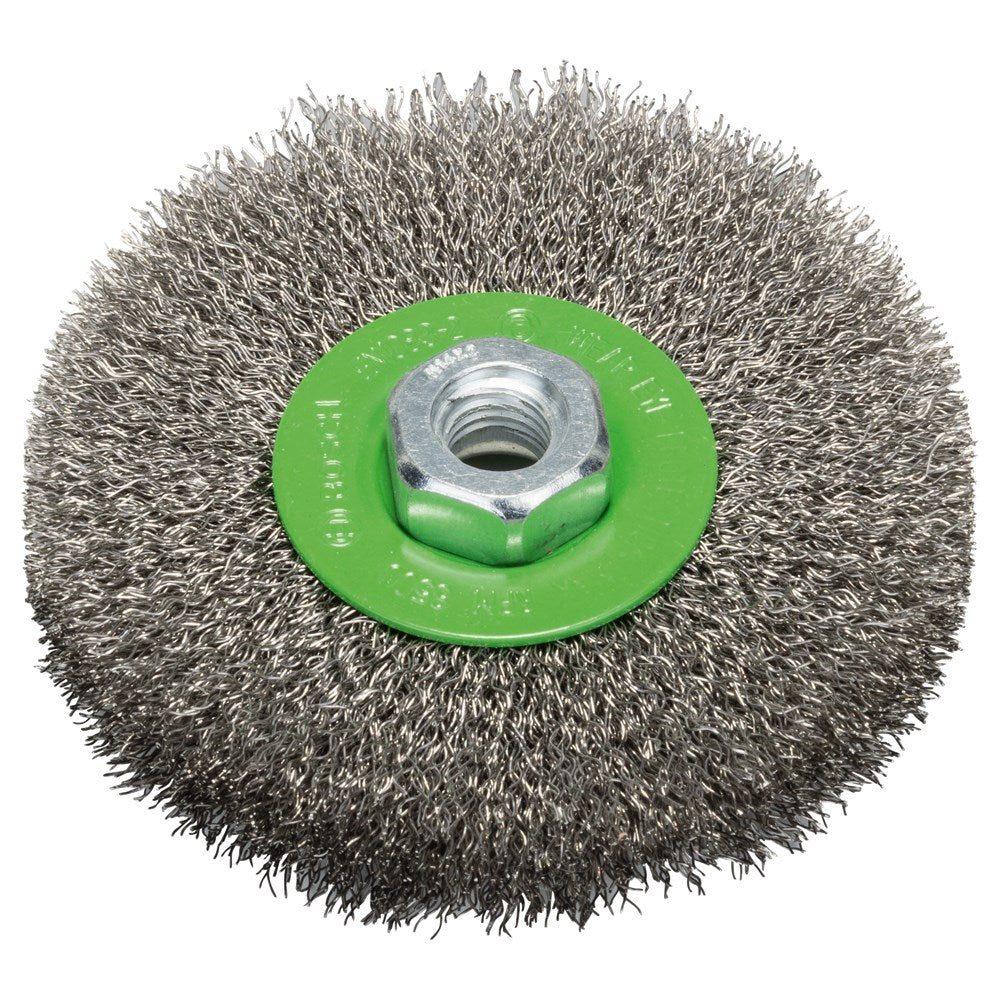 De Clean for Inox schijfborstel biedt een ultrafijne afwerking van het oppervlak. De borstel is voorzien van gegolfde draad voor lichte tot middelzware reinigingswerkzaamheden op kleine oppervlakken. De schijfborstel is ideaal voor het verwijderen van aanloopkleur op lasnaden en geschikt voor reinigingswerkzaamheden bij hoge omtreksnelheden op kleinere oppervlakken, op randen of in groeven. De schijfborstel is ook geschikt voor het ontroesten, opruwen, matteren, ontlakken en structureren van oppervlakken van roestvast staal en non-ferrometalen.