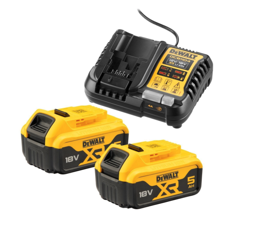 Accuset DCB1104P2 met 2× 18V 5,0Ah Li-ion accu’s en XR multilader; geschikt voor alle DeWalt XR-machines.