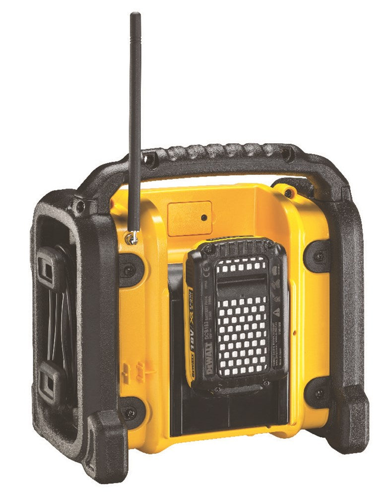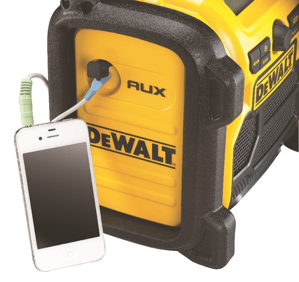 Robuuste en compacte FM/AM bouwradio, compatibel met 10,8V, 14,4V en 18V XR Li-Ion accu's, voorzien van 3,5mm AUX-ingang en beschermende rolkooi. Geleverd zonder accu's en lader.