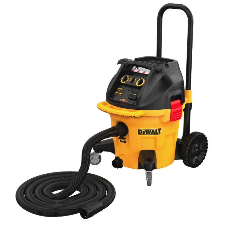 Krachtige DeWalt DWV905H-QS nat-/droogstofzuiger 38L 1400W met automatische filterreiniging en H-klasse filtratie; geschikt voor fijnstof en vloeistoffen.