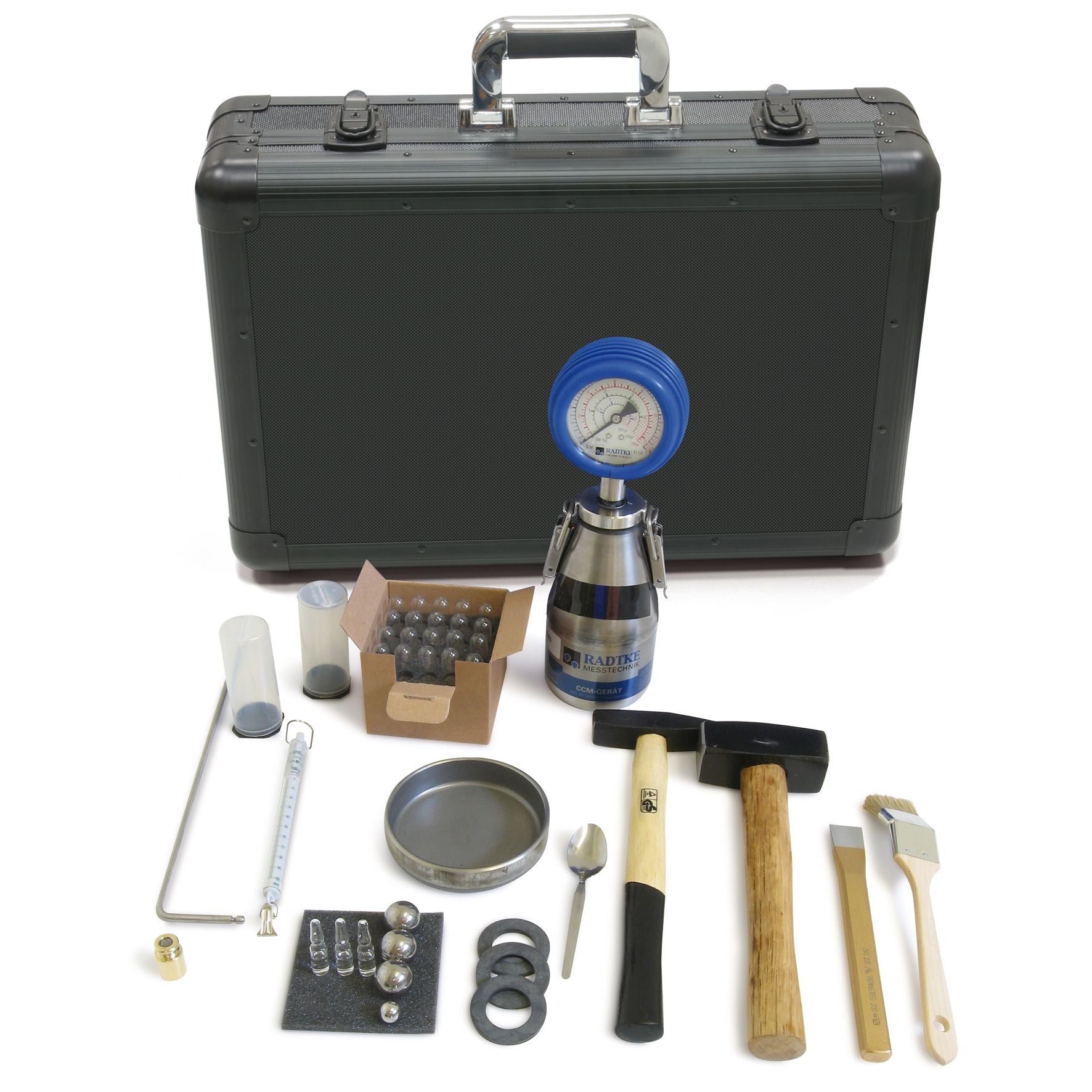 Dryfast CMKOFFER Calciumcarbide Classic meetkoffer voor nauwkeurige vochtmeting in bouwmaterialen. Compleet met digitale weegschaal, maatbekers, reagentenset en transportkoffer.