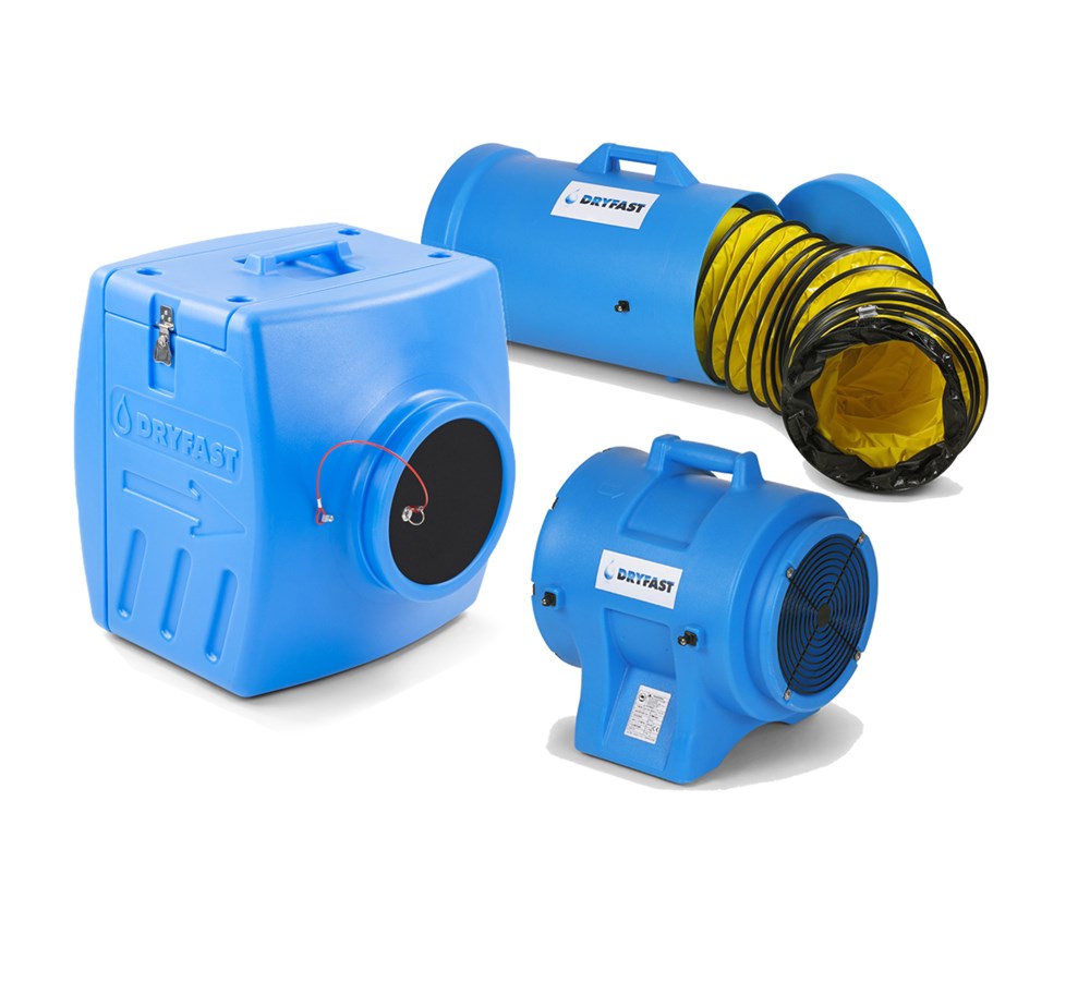 Dryfast DAF3000 ventilator met filterboxen CAN3900, 7,6m slanglengte voor effectieve luchtverplaatsing en filtering in grote ruimtes. Ideaal voor een schoon binnenklimaat.