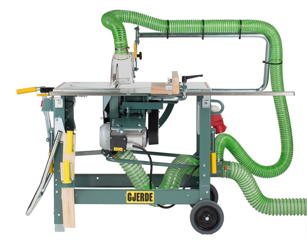 Set bevat: Gjerde 1603-NL Bouwzaag 3,6kW 400V met mechanische rem, HM zaagblad 400mm, wielstel, tilbeugel, 2x duwhout en transparante beschermkap. Geschikt voor diverse zaagtoepassingen op de bouwplaats.