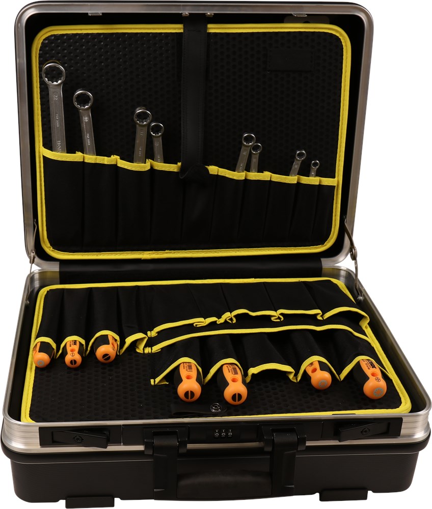 88-delig. Schalen van ABS-kunststof met robuust aluminium frame. Voorzien van twee gereedschapsbladen, documentenvak en bodembak. Vrij indeelbaar met twee langschotten en drie dwarsschotten, bodemgeleiders en afdekplaat.