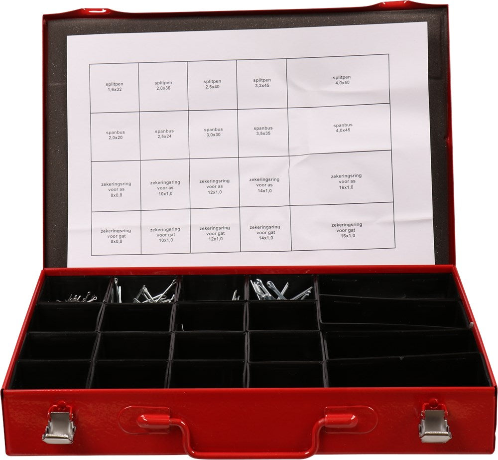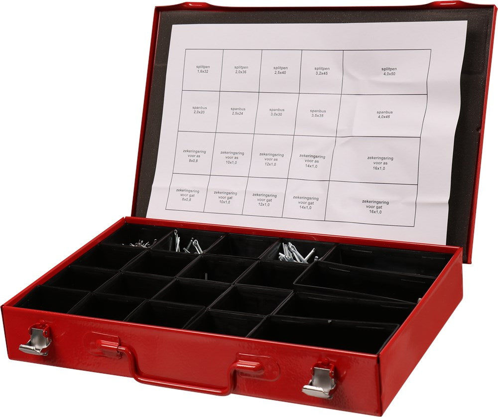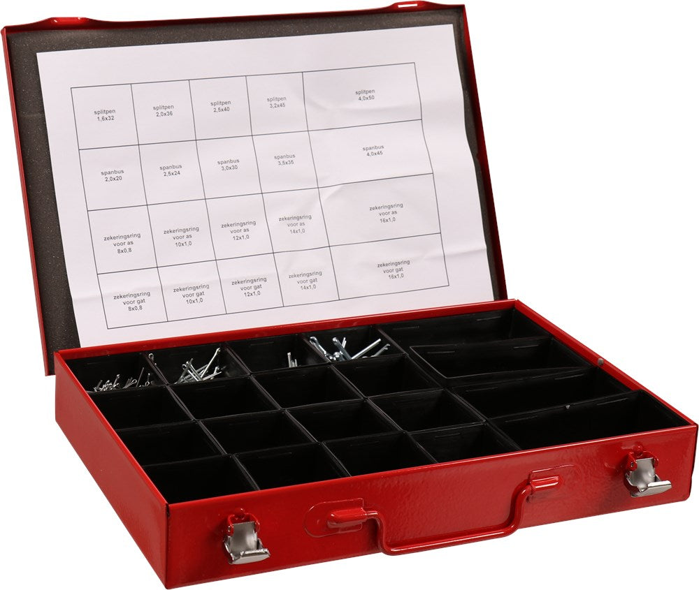 Metalen rood gelakte kist met twee sluitingen en losse kunststof inzetbakjes. Afmeting 330x234x47 mm.