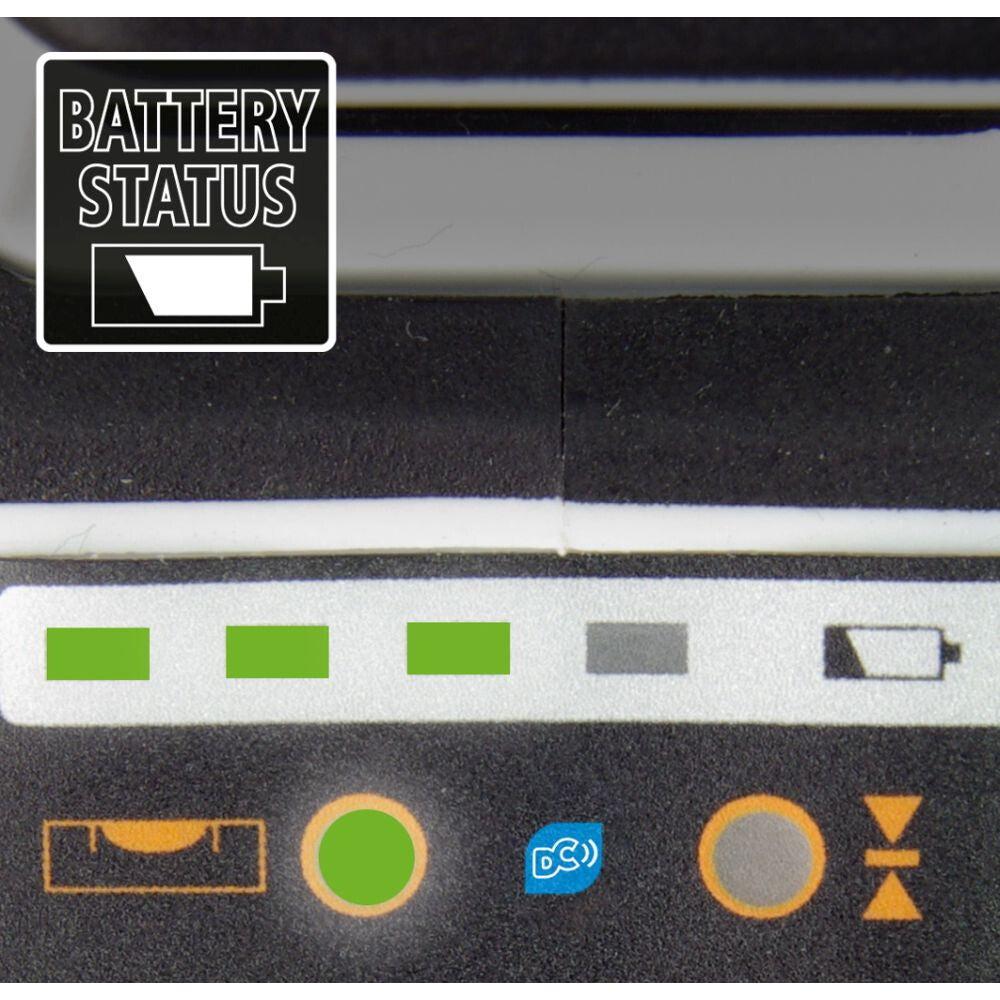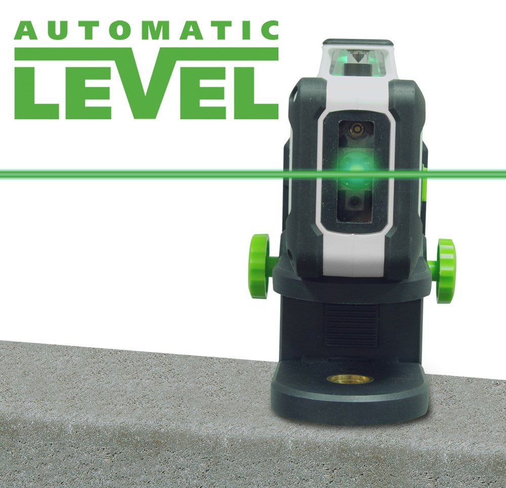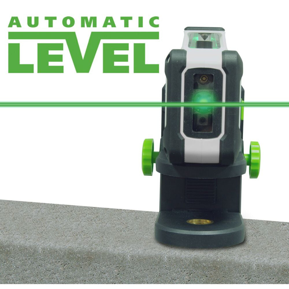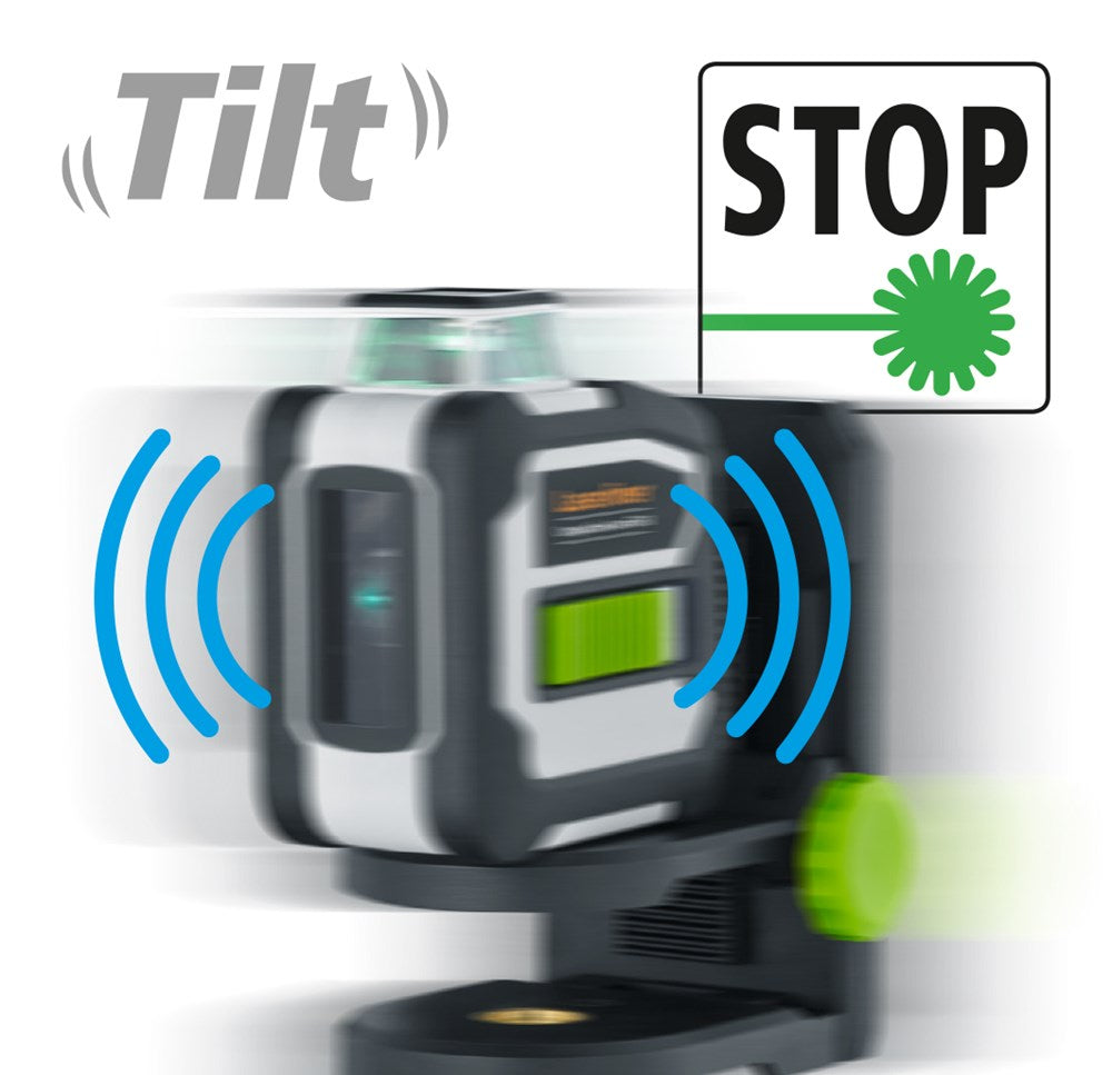 Set bevat: Groene 360°-lijnlaser met compact statief van 165cm en Digital Connection-interface voor nauwkeurige uitlijning van objecten in de gehele ruimte, inclusief tiltfunctie en afstandsbediening via smartphone.