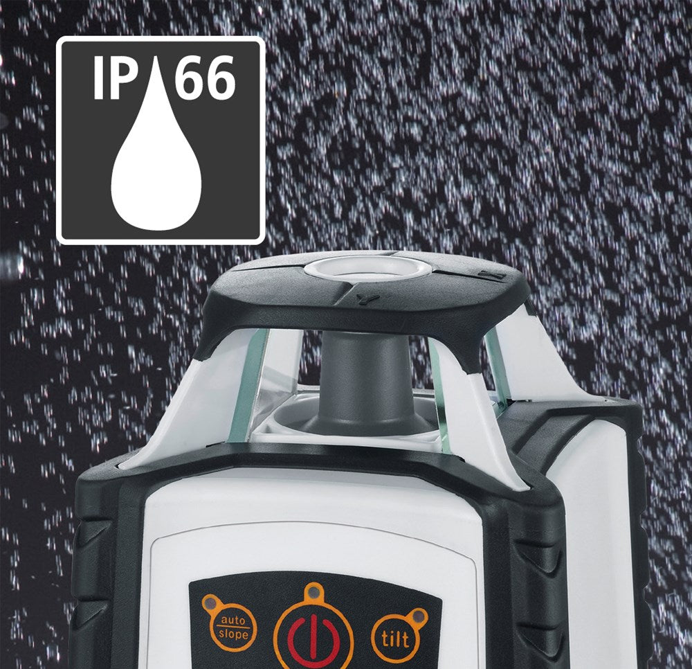 Set bevat: Volautomatische rotatielaser met statief van 150cm, laserontvanger en meetlat, geschikt voor horizontale en verticale uitlijning, inclusief afstandsbediening en draagkoffer.