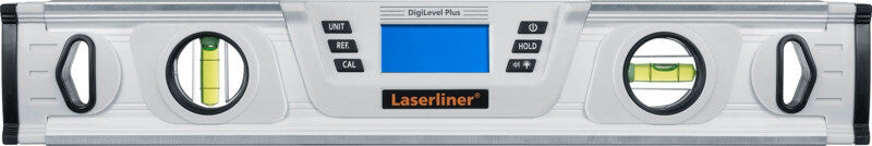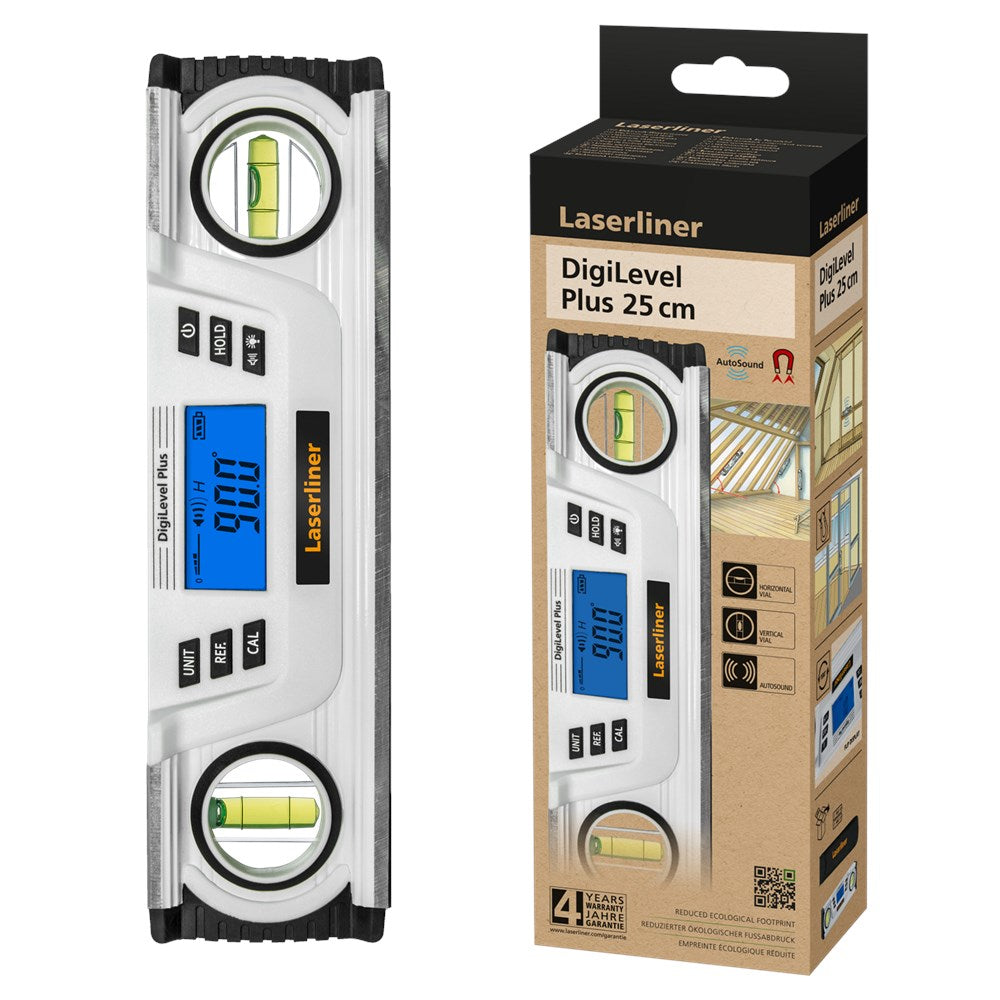 Set bevat: Digitale waterpas met flipdisplay en akoestisch signaal, geschikt voor bouw, interieurafwerking en metaalbewerking; inclusief transporttas en batterijen.
