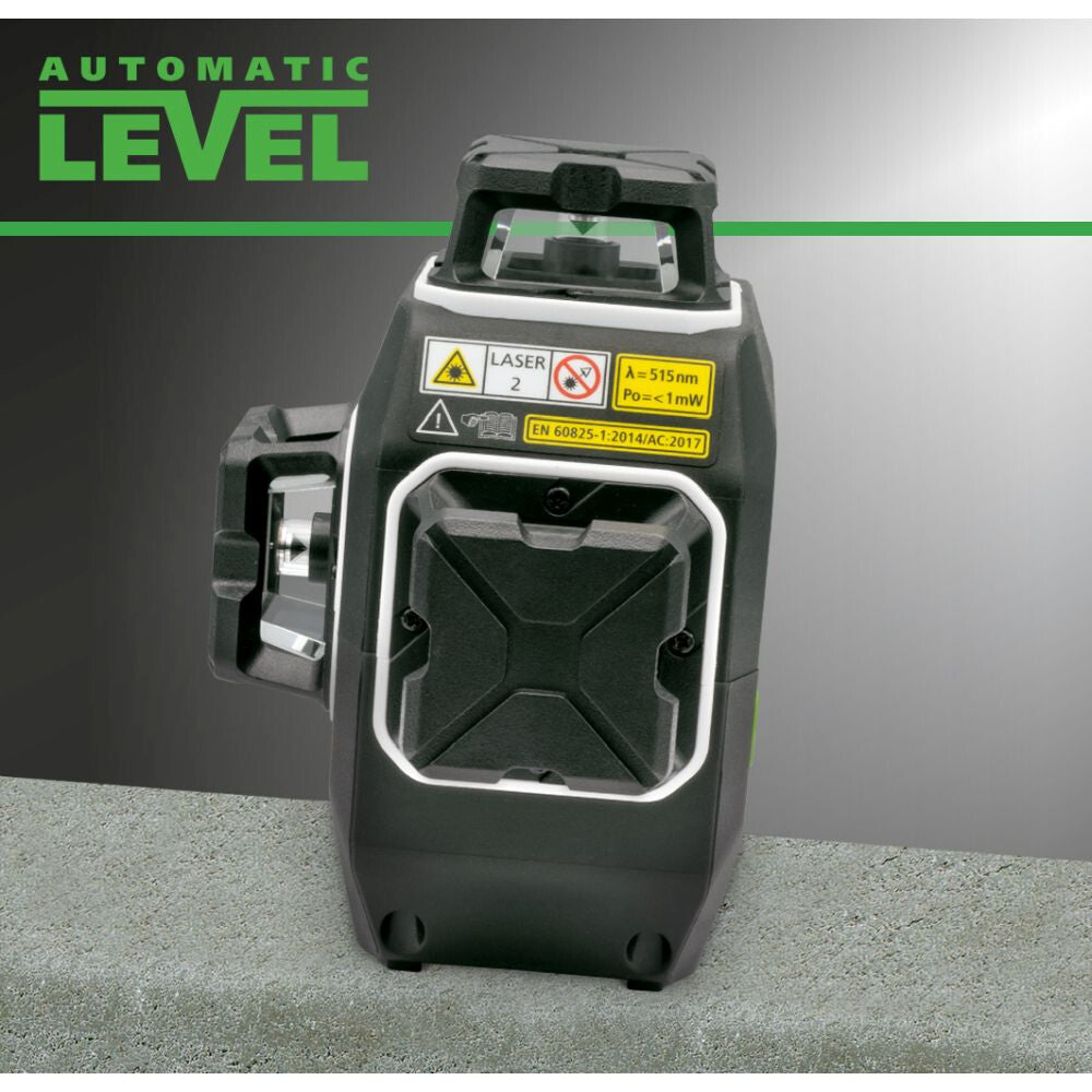 Set bevat: Driedimensionale laser met groene lasertechnologie voor nauwkeurige uitlijning; geschikt voor bouw, interieurafwerking en tegelwerk; inclusief klem- en wandhouder, twee Li-ion accu's en L-BOXX koffer.