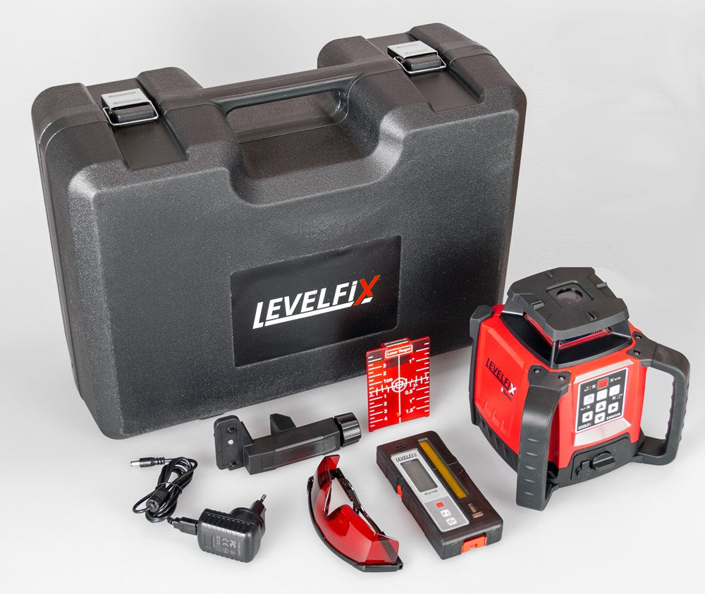 LEVELFIX 550HV bouwlaser met rode straal, 600m werkbereik en 4,8 mm/100m nauwkeurigheid. IP66-bescherming, 55 uur accuduur, tilt- en scanfuncties. Compleet met digitale ontvanger en transportkoffer. 4 jaar garantie na registratie.