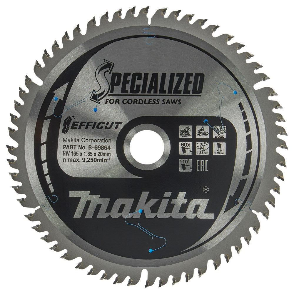 Makita heeft een uitgebreid assortiment cirkelzaagbladen voor de diverse machines. Kies een zaagblad voor het te zagen materiaal en passend op de te gebruiken machine; er zijn verschillende kwaliteiten, waarbij de Makita Efficut zaagbladen tot het top segment behoren. Voor meer informatie omtrent cirkelzaagbladen zie het Makita kenniscentrum: https://www.makita.nl/kenniscentrum/cirkelzaagbladen-en-de-technieken-erachter.html Afkortzaagblad hout Efficut met 60-tands ATBR-vertanding onder een hoek van 10 graden. Het Efficut zaagblad is een bijzonder efficiënt afkortzaagblad dankzij een nieuw tandontwerp. De tand heeft namelijk een holle uitsnede. Hierdoor heeft de tand een kleiner raakvlak met het te verspanen materiaal, is hij scherper én kan hij door de holling de verspaning beter kwijt. Tevens voorzien van lasersleuven voor een reductie in trillingen en geluid en voorzien van een teflon coating tegen roestvorming en tegen het kleven van lijmhoudende materialen. Deze technieken én een bladdikte van slechts 1,85 mm zorgen voor snel en efficiënt zagen met aanzienlijk minder stofproductie van: - Gemelamineerde spaanplaat; - MDF; - Laminaat; - Hout. Dit zaagblad met ATBR-vertanding is geschikt voor afkortzagen. Door dit zaagblad te gebruiken in combinatie met een accu-afkortzaag, kunnen er meer zaagsnedes op één acculading worden behaald.