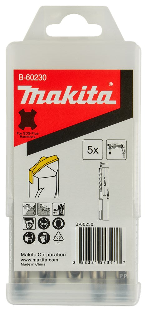 Makita kent een uitgebreide range aan betonboren. Voor elke klus en portemonnee is een betonboor beschikbaar: SP4S: Stofvrij Premium 4-snijder: Hoogste kwaliteit 4-snijder voor stofvrij werken. TNO-certificering met 8-uurs label in combinatie met een B-label stofzuiger. Voor droog metselwerk, beton, gewapend beton en (natuur)steen. P4S: Premium 4-snijder: Hoogste kwaliteit 4-snijder met lange levensduur. Door zijn dynamische boorpunt met unieke snijgeometrie en geoptimaliseerde spiraalvorm mag deze boor zich onder de beste in zijn soort scharen. Geschikt voor (gewapend) beton en (natuur)steen. B4S: Basis 4-snijder is een uitstekende boor die uitblinkt in zijn prijs-kwaliteitsverhouding. P2S: Premium 2-snijder: Hoge kwaliteit 2-snijder met lange levensduur. De dynamisch gevormde boorpunt garandeert een hoge boorsnelheid, de variabele boorspiraal zorgt voor een optimale afvoer van het boorgruis. B2S: Basis 2-snijder is een uitstekende boor die uitblinkt in zijn prijs-kwaliteitsverhouding. Makita betonboor met SDS-PLUS aansluiting en afmeting 5x110mm. Verpakking van 5 stuks.