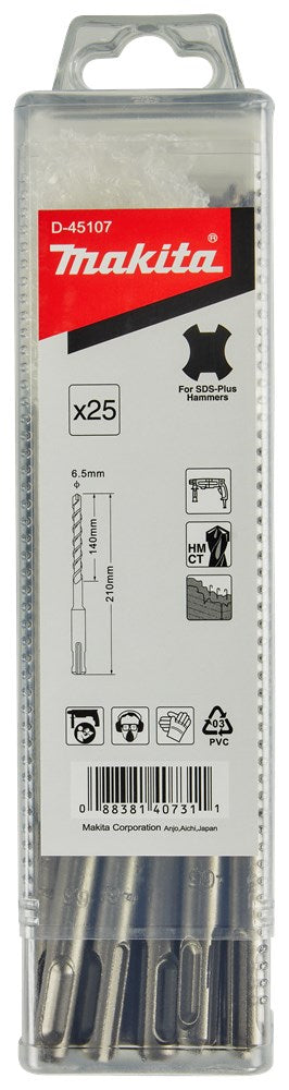 Makita kent een uitgebreide range aan betonboren. Voor elke klus en portemonnee is een betonboor beschikbaar: SP4S: Stofvrij Premium 4-snijder: Hoogste kwaliteit 4-snijder voor stofvrij werken. TNO-certificering met 8-uurs label in combinatie met een B-label stofzuiger. Voor droog metselwerk, beton, gewapend beton en (natuur)steen. P4S: Premium 4-snijder: Hoogste kwaliteit 4-snijder met lange levensduur. Door zijn dynamische boorpunt met unieke snijgeometrie en geoptimaliseerde spiraalvorm mag deze boor zich onder de beste in zijn soort scharen. Geschikt voor (gewapend) beton en (natuur)steen. B4S: Basis 4-snijder is een uitstekende boor die uitblinkt in zijn prijs-kwaliteitsverhouding. P2S: Premium 2-snijder: Hoge kwaliteit 2-snijder met lange levensduur. De dynamisch gevormde boorpunt garandeert een hoge boorsnelheid, de variabele boorspiraal zorgt voor een optimale afvoer van het boorgruis. B2S: Basis 2-snijder is een uitstekende boor die uitblinkt in zijn prijs-kwaliteitsverhouding. Makita betonboor met SDS-PLUS aansluiting, afmeting 6,5x210mm. Verpakking met 25 stuks.
