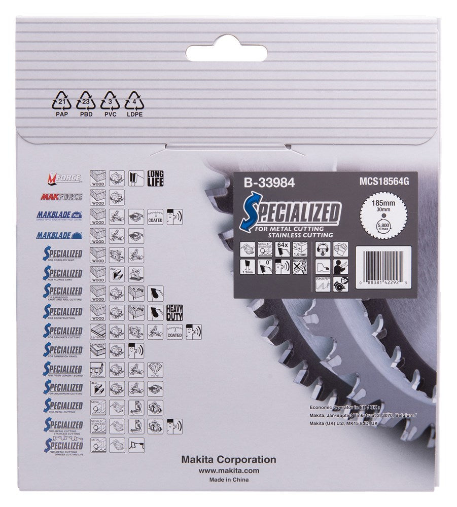Set bevat: Makita B-33984 Cirkelzaagblad RVS/Staal 185x30x1,6mm 64T – B-33984. Geschikt voor het nauwkeurig en braamvrij zagen van RVS en andere metalen materialen.