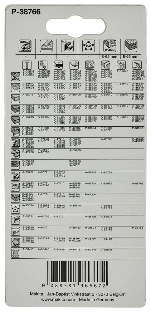 De keuze van een decoupeerzaagblad is afhankelijk van het te zagen materiaal, de dikte van het materiaal en of er rechte lijnen of bochten gezaagd worden. Deze zaagbladen zijn geschikt voor machines met een enkelnokkenschacht aansluiting. Hardmetalen decoupeerzaagblad. Lange levensduur. Voor het snel en recht zagen in dik materiaal: glasvezelversterkt kunststof (GVK), gipsplaat, gipsvezelplaat, vezelcementplaat, hout en hardhout.