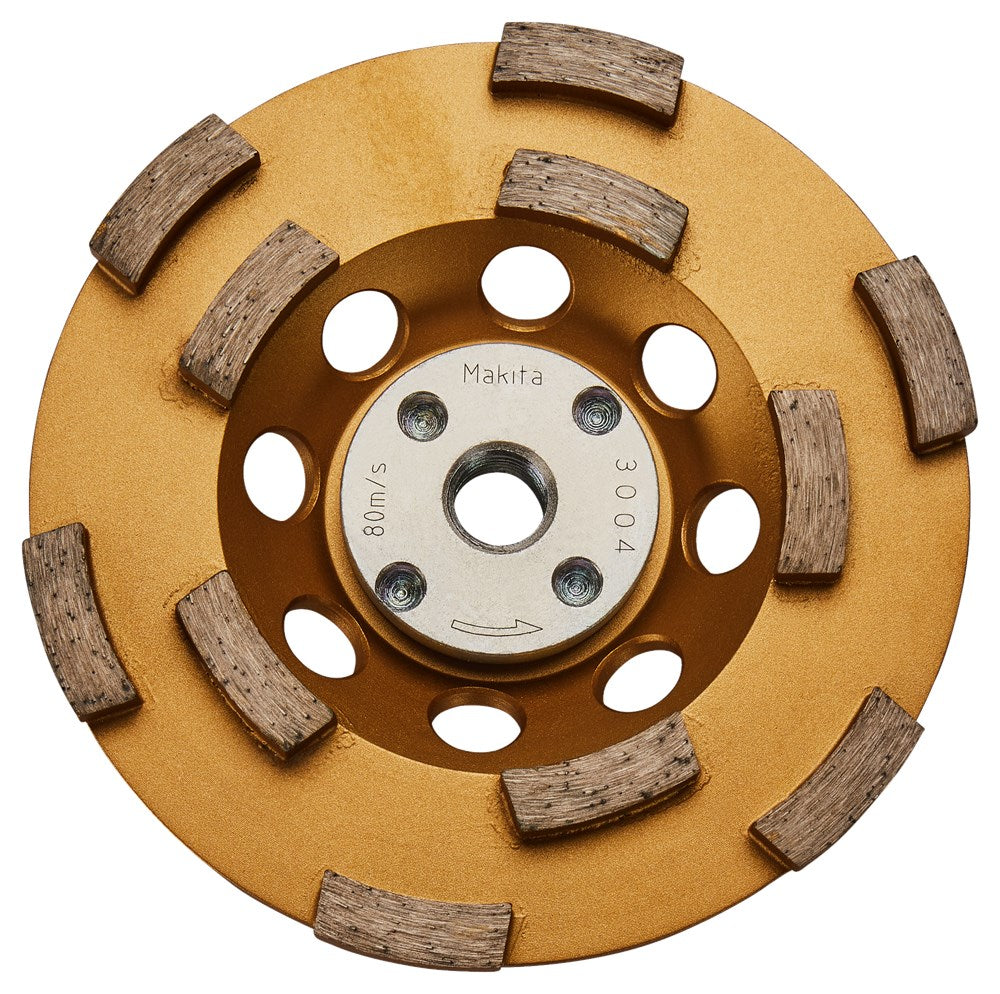 Makita anti-vibratie 125 mm diamant komschijf met twee rijen segmenten. De dubbele rij geeft meer stabiliteit op het oppervlak dan het type met enkele rij. Voor een snelle grove afname van een oppervlak van beton en diverse steensoorten. Alleen geschikt voor de 125 mm haakse slijper met SJS, SJSII of softstart. Het gewicht van de komschijf is dermate hoog dat deze bij het starten van de machine teveel belasting geeft op de tandwielen van een haakse slijper. SJS, SJSII en softstart voorkomen deze overbelasting. Deze anti-vibratie komschijf is ongeschikt voor de 125 mm betonschaaf. De spindel van de betonschaaf is te kort waardoor de schijf te ver onder de machine uit steekt. Dat maakt deze combinatie instabiel en de stofafzuiging inefficiënt. Gebruik op een betonschaaf alleen komschijven met een asgat van 22,23 mm.