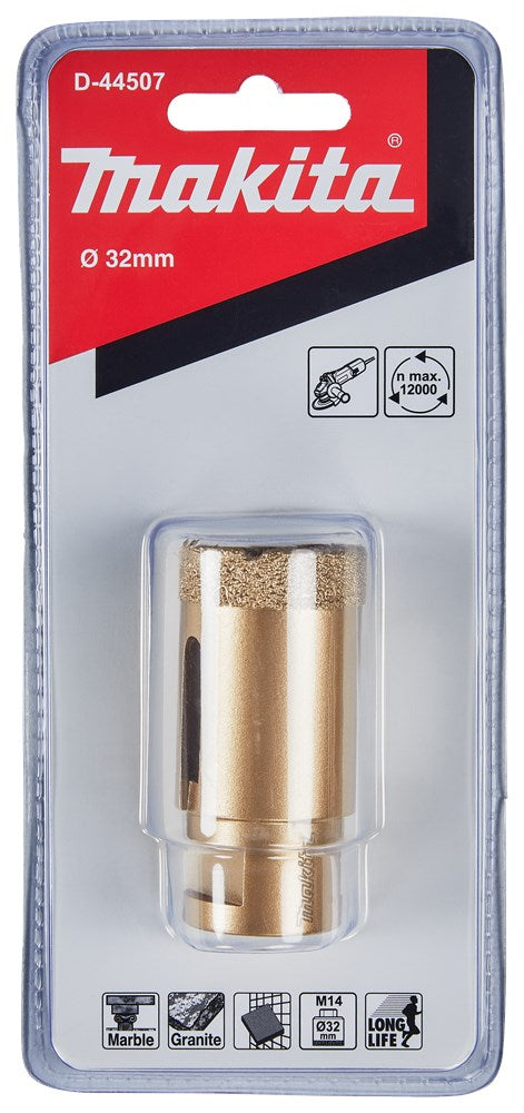 Makita diamantboor voor droog gebruik. Geschikt voor het boren van porseleinen tegels. Makita diamantboor met M14 aansluiting, diameter 32mm. Geschikt voor boren in bijvoorbeeld graniet en marmer.