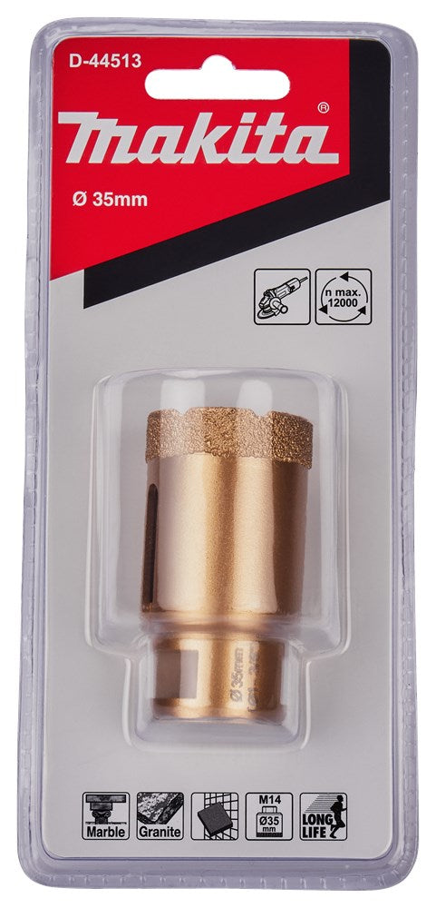Makita diamantboor voor droog gebruik. Geschikt voor het boren van porseleinen tegels. Makita diamantboor met M14 aansluiting, diameter 35mm. Geschikt voor boren in bijvoorbeeld graniet en marmer.