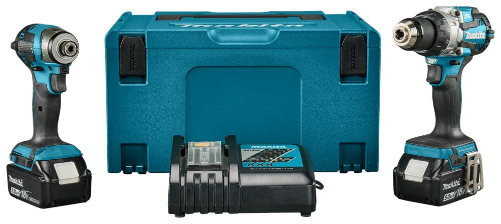 Set bevat: DDF489 boor-/schroefmachine en DTD173 slagschroevendraaier, inclusief 2 x 5,0Ah accu's, snellader, draaghaak en Mbox koffer.