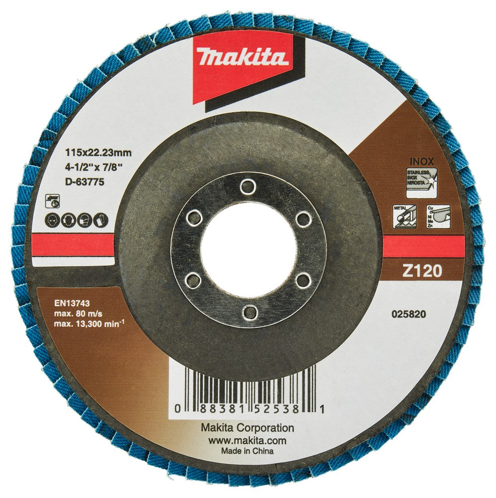 Lamellenschuurschijven zijn voorzien van lamellen bestaande uit een rug van vezelstof en korrels. Deze zijn geplaatst op een schijf met een rug van glasvezels. Doordat de schijf opgebouwd is uit lamellen is deze veerkrachtiger dan een schuurschijf en minder agressief voor het te bewerken materiaal. Bijzonder geschikt voor het schuren van lasnaden. Soorten korrel: Aluminiumoxide [A]: Zeer geschikt voor staal. Geschikt voor aluminium, non-ferro metalen en kunststoffen. Zirkoniumoxide [Z]: Zeer geschikt voor RVS. Geschikt voor staal, aluminium en non-ferro metalen. Keramisch aluminiumoxide [Ce]: Zeer geschikt voor RVS. Geschikt voor staal, aluminium en non-ferro metalen. Siliciumcarbide [S]: Zeer geschikt voor mortel en steen. Vom van de schijf: Vlakke schijven gebruik je voor het vlakschuren van oppervlakken. Plaatst deze onder een hoek van 0-15° op het materiaal voor een optimaal gebruik. Schuine schijven gebruik je voor het schuren van lasnaden, slijpen van vellingkanten en ontbramen. Plaats deze onder een hoek van 10-25° op het materiaal voor een optimaal gebruik. Korrels: 36/40: Lasnaadbewerking en vellingkanten. 60: Lasnaadbewerking, vellingkanten, ontbramen en vlakschuren. 80: Ontbramen en vlakschuren. 120: Vlakschuren. Voordelige Makita zirkonium-aluminiumoxide lamellenschuurschijf schuin met glasvezel versterkte rug. Diameter 115mm met korrel 120. Zeer geschikt voor: metaal. Geschikt voor: RVS en non-ferro metalen. Voor intensief gebruik raden wij lamellenschuurschijf B-22654 of D-27464 aan. Tevens verkrijgbaar in 10-pack D-63775-10.