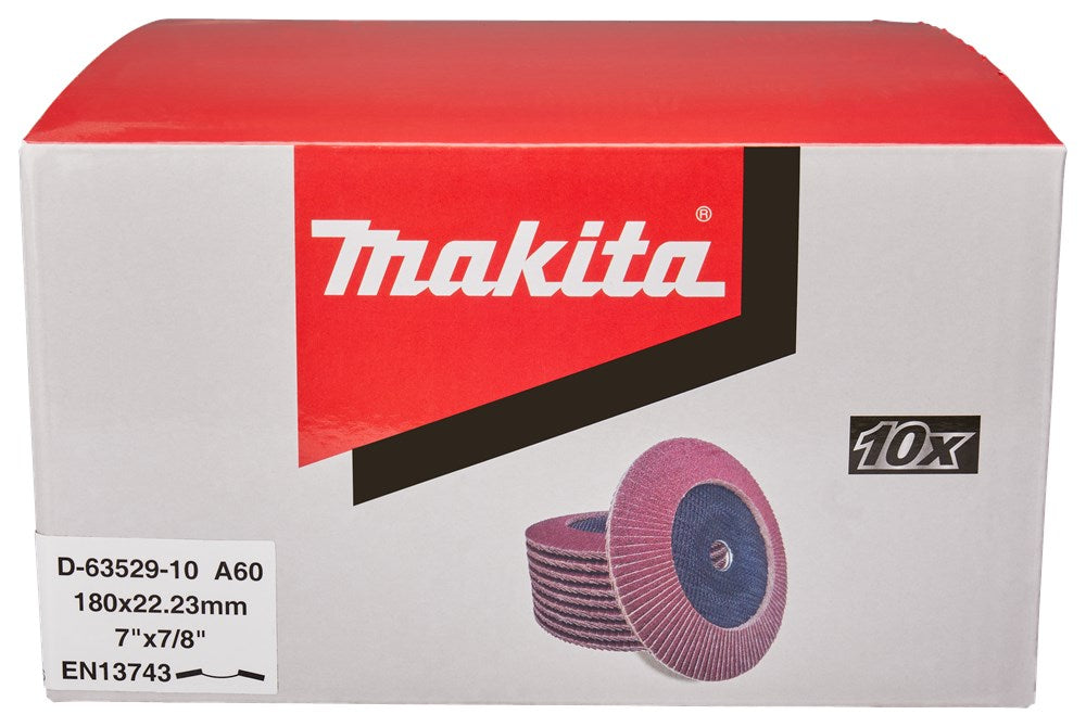 Lamellenschuurschijven zijn voorzien van lamellen bestaande uit een rug van vezelstof en korrels. Deze zijn geplaatst op een schijf met een rug van glasvezels. Doordat de schijf opgebouwd is uit lamellen is deze veerkrachtiger dan een schuurschijf en minder agressief voor het te bewerken materiaal. Bijzonder geschikt voor het schuren van lasnaden. Soorten korrel: Aluminiumoxide [A]: Zeer geschikt voor staal. Geschikt voor aluminium, non-ferro metalen en kunststoffen. Zirkoniumoxide [Z]: Zeer geschikt voor RVS. Geschikt voor staal, aluminium en non-ferro metalen. Keramisch aluminiumoxide [Ce]: Zeer geschikt voor RVS. Geschikt voor staal, aluminium en non-ferro metalen. Siliciumcarbide [S]: Zeer geschikt voor mortel en steen. Vom van de schijf: Vlakke schijven gebruik je voor het vlakschuren van oppervlakken. Plaatst deze onder een hoek van 0-15° op het materiaal voor een optimaal gebruik. Schuine schijven gebruik je voor het schuren van lasnaden, slijpen van vellingkanten en ontbramen. Plaats deze onder een hoek van 10-25° op het materiaal voor een optimaal gebruik. Korrels: 36/40: Lasnaadbewerking en vellingkanten. 60: Lasnaadbewerking, vellingkanten, ontbramen en vlakschuren. 80: Ontbramen en vlakschuren. 120: Vlakschuren. Voordelige Makita aluminiumoxide lamellenschuurschijf schuin met glasvezel versterkte rug. Diameter 180mm met korrel 60. Zeer geschikt voor: metaal. Geschikt voor: kunststof, non-ferro metalen en hout. Verpakkingseenheid: 10 stuks.