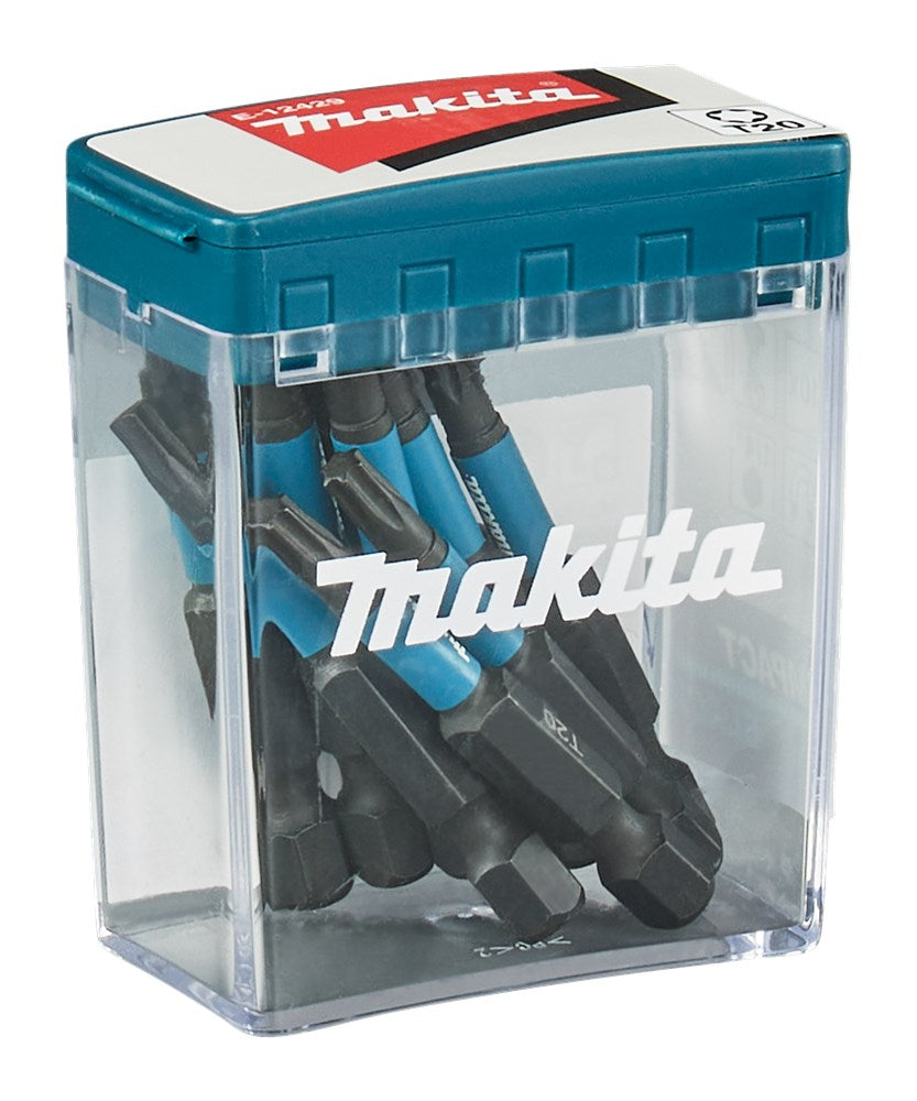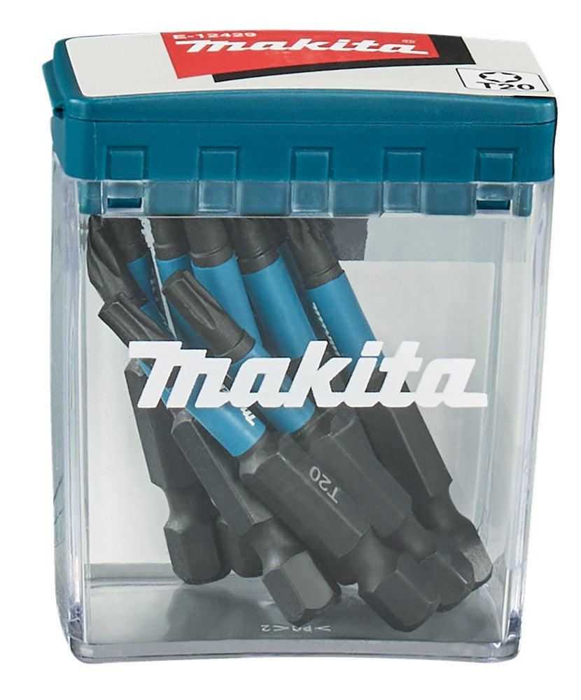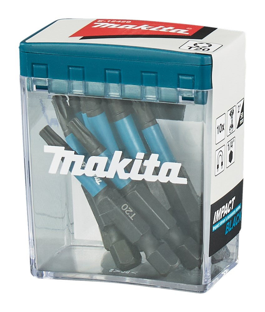 Makita schroefbits en slagschroefbits in verschillende lengtes en paskoppen. Voor elke klus is er een geschikte schroefbit beschikbaar. Kwalitatieve schroefbits in opbouw van Standaard, Impact Black, Impact Silver en Impact Gold naar Impact Premier. Torx-bit T20 uit de Makita Impact Black-serie. Door hoog torsievermogen ook geschikt voor de slagschroevendraaier. Deze bits hebben een betere pasvorm dan de standaard Makita bits, en de zwarte coating voorkomt roestvorming. Met 1/4" vorm E-opname in de lengte 50 mm. 10 stuks in handige meeneemverpakking.