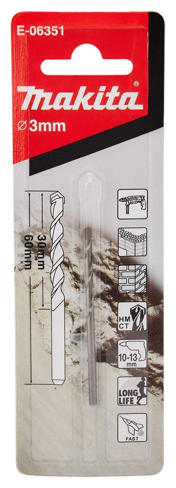 Makita steenboor 3x60mm voor klopboormachine, met cilindrische aansluiting. Deze boor heeft een extra brede spiraal om steengruis makkelijk af te voeren en een TCT versterkte centreerpunt. Geschikt voor het boren in baksteen, snelbouwsteen en kalkzandsteen.