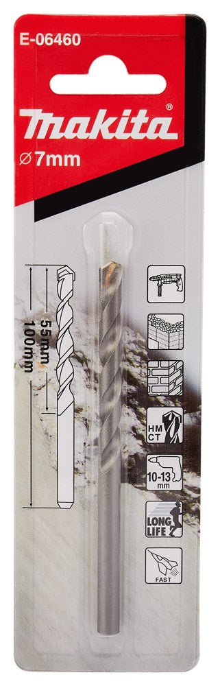 Makita steenboor 7x100mm voor klopboormachine, met cilindrische aansluiting. Deze boor heeft een extra brede spiraal om steengruis makkelijk af te voeren en een TCT versterkte centreerpunt. Geschikt voor het boren in baksteen, snelbouwsteen en kalkzandsteen.