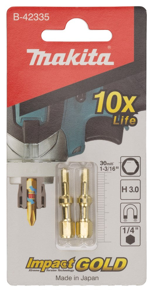 Makita schroefbits en slagschroefbits in verschillende lengtes en paskoppen. Voor elke klus is er een geschikte schroefbit beschikbaar. Kwalitatieve schroefbits in opbouw van Standaard, Impact Black, Impact Silver en Impact Gold naar Impact Premier. Inbus/Hex-bit H3 uit de Makita XTT Impact Gold-serie. Dankzij extreem hoog torsievermogen en perfecte pasvorm ideaal geschikt voor de slagschroevendraaier. Met 1/4" vorm E-opname in de lengte 30 mm. Twee H3-bits per verpakking.
