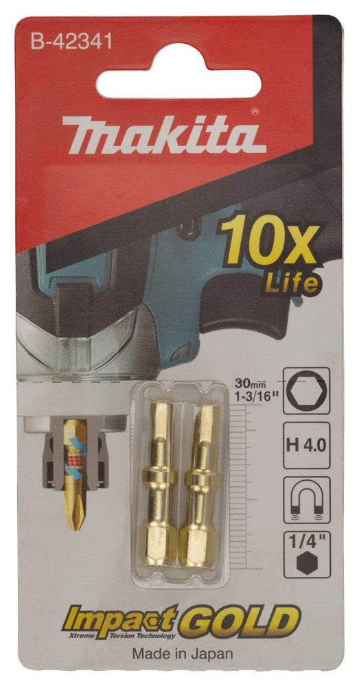Makita schroefbits en slagschroefbits in verschillende lengtes en paskoppen. Voor elke klus is er een geschikte schroefbit beschikbaar. Kwalitatieve schroefbits in opbouw van Standaard, Impact Black, Impact Silver en Impact Gold naar Impact Premier. Inbus/Hex-bit H4 uit de Makita XTT Impact Gold-serie. Dankzij extreem hoog torsievermogen en perfecte pasvorm ideaal geschikt voor de slagschroevendraaier. Met 1/4" vorm E-opname in de lengte 30 mm. Twee H4-bits per verpakking.