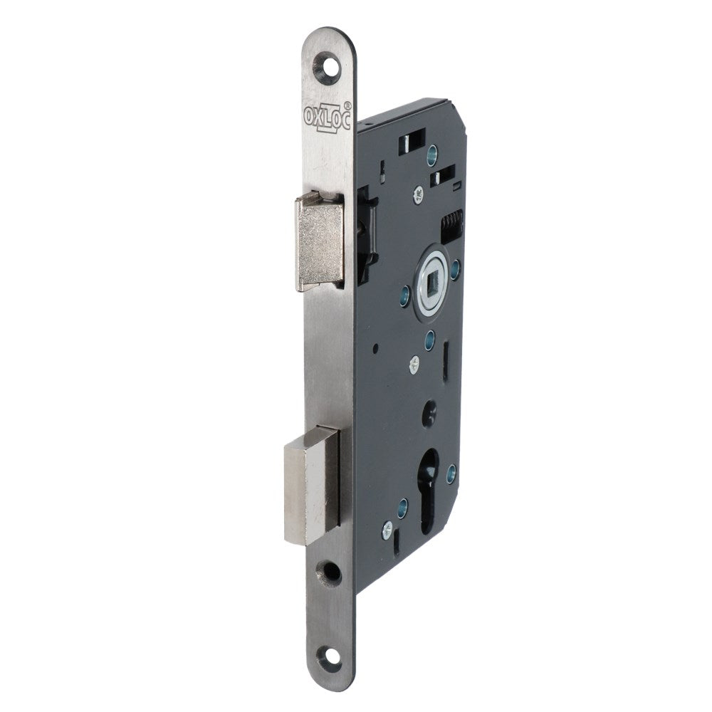 Oxloc cilinderslot D/N RVS PC72 met ronde voorplaat, geschikt voor DIN-linkse en DIN-rechtse deuren, duurzame afwerking, ideaal voor woningen en kantoren.