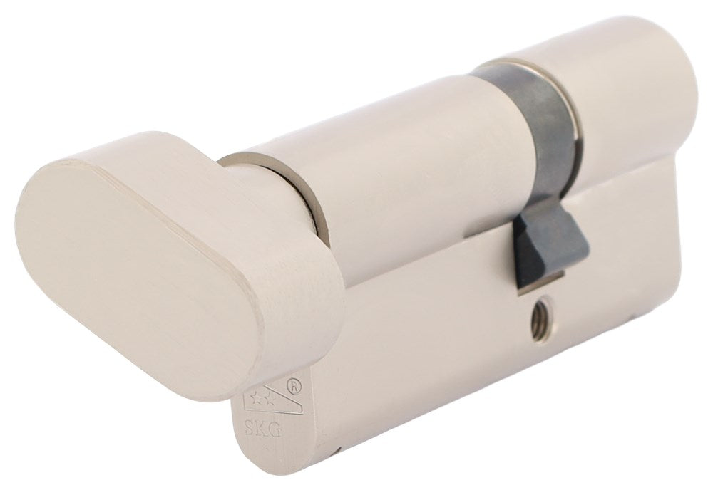 Oxloc knopcilinder SKG** met sleutel- en draaiknopbediening, verkrijgbaar in diverse maten (30/K30 tot 50/K45), mat nikkel afwerking, inbraakwerend met anti-slag-, anti-boor- en kerntrekbeveiliging.