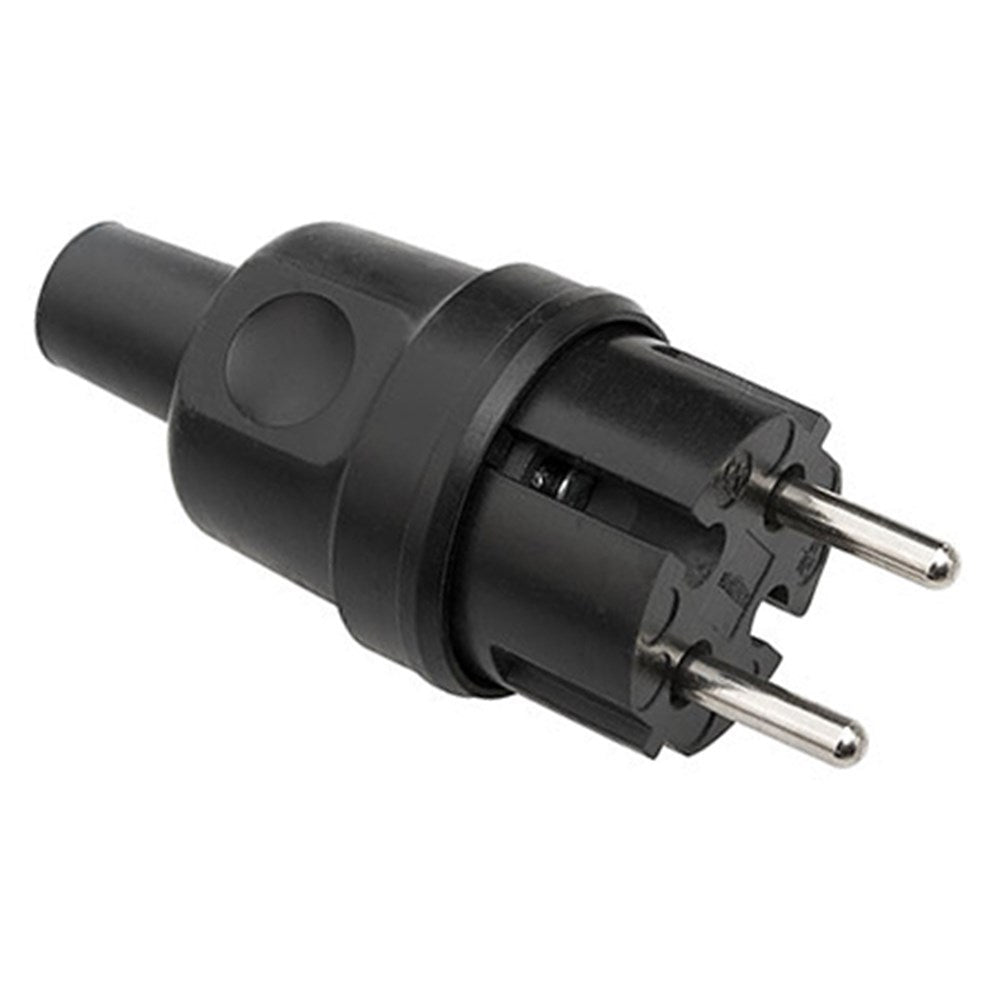 Set bevat: volrubberen contactstop 2‑polig met randaarde, geschikt voor 230V/10–16A, IP44‑bescherming voor bouw, industrie en buitengebruik.