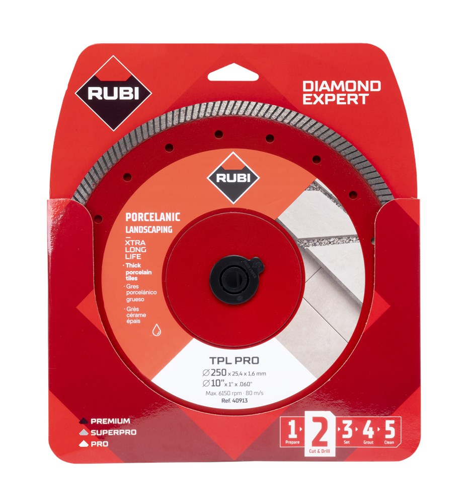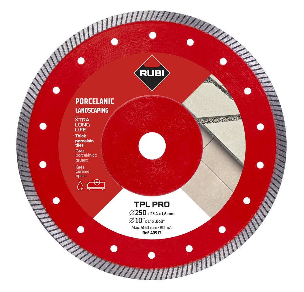 Het TPL PRO blad is ideaal voor het zagen van 20 mm dik porcellanato. Het wordt echter ook aanbevolen voor het zagen van keramische tegels, natuursteen en gesinterd steen van hoge hardheid.Dankzij zijn ontwerp en samenstelling is het TPL PRO blad bijzonder geschikt voor het zagen van harde materialen voor de hovenier.Het belangrijkste kenmerk van het TPL PRO blad is het TURBO type, waardoor het een hoge zaagsnelheid heeft met een goede afwerking.De TPL PRO-schijf is van PRO-kwaliteit en biedt de professional een uitstekende prijs/kwaliteitsverhouding.Het assortiment TPL PRO-zaagbladen bestaat uitbladen met een diameter van 250 mm en 300 mm.De TPL PRO-zaagbladen hebben een aantal openingen in de stalen kern om het blad te helpen koelen, zodat het water gelijkmatig over het hele oppervlak van de schijf wordt verdeeld. Dit resulteert in een lange levensduur en een goede zaagkwaliteit.Rekening houdend met de bijzonderheden van elk type zaagblad (continue, turbo, enz.) en de materialen waarvoor deze zijn ontworpen, biedt RUBI de professional drie kwaliteiten zaagbladen: PRO, SUPERPRO en PREMIUM.De PRO-bladen bieden de professionele gebruiker de beste prijs-prestatieverhouding.SUPERPRO bladen benadrukken het belangrijkste kenmerk van elk zaagblad. Ze zijn de juiste keuze voor de meest veeleisende werkzaamheden.PREMIUM-zaagbladen zijn de meest gespecialiseerde optie. Altijd met de beste resultaten.RUBI adviseert het gebruik van geschikte kleding, veiligheidsschoenen, een veiligheidsbril, gehoorbescherming, hoofdbescherming, een stofmasker of een ander type ademhalingsapparaat.Bij het zagen met diamantzaagbladen moeten de instructies voor een veilig gebruik van de apparatuur strikt worden opgevolgd ter bescherming van de gebruiker en anderen in de omgeving van het zaaggebied.
