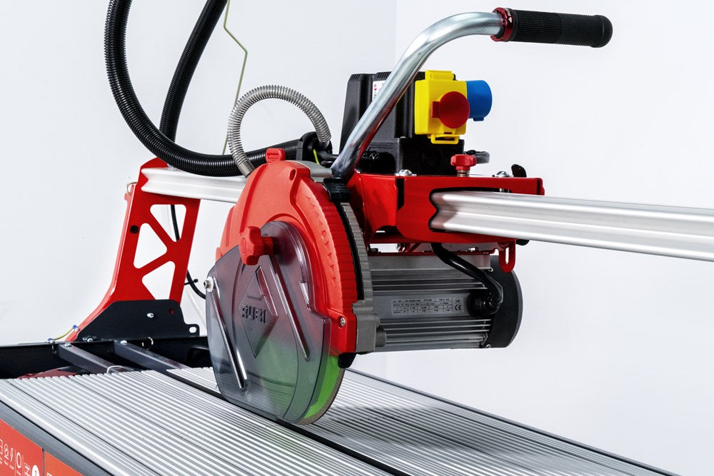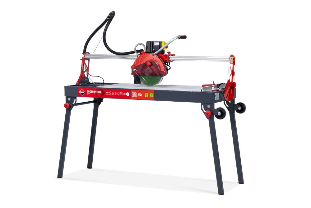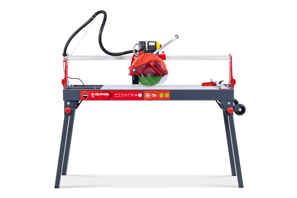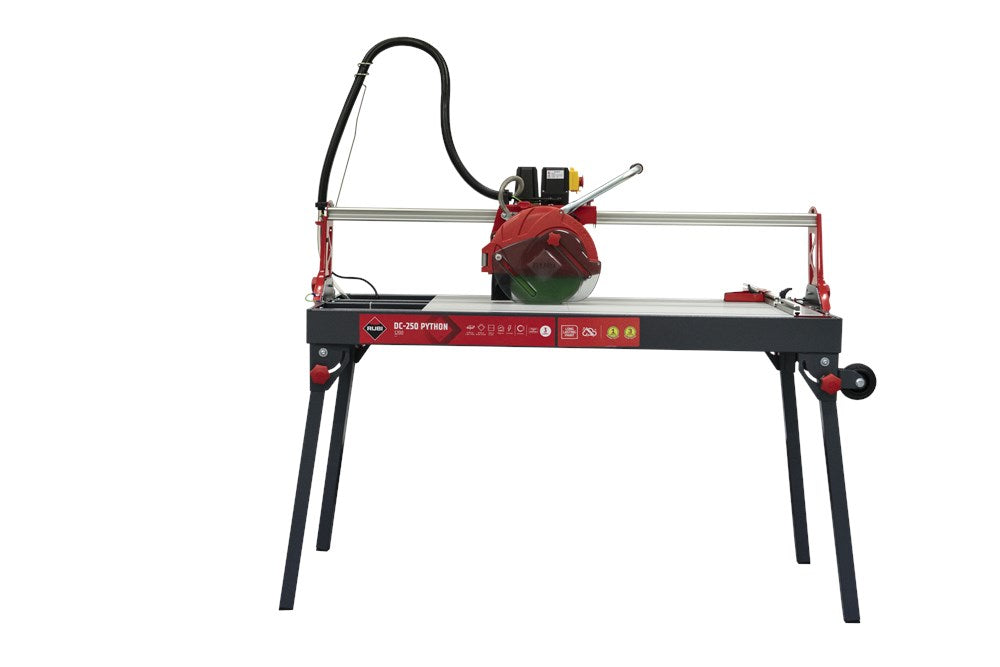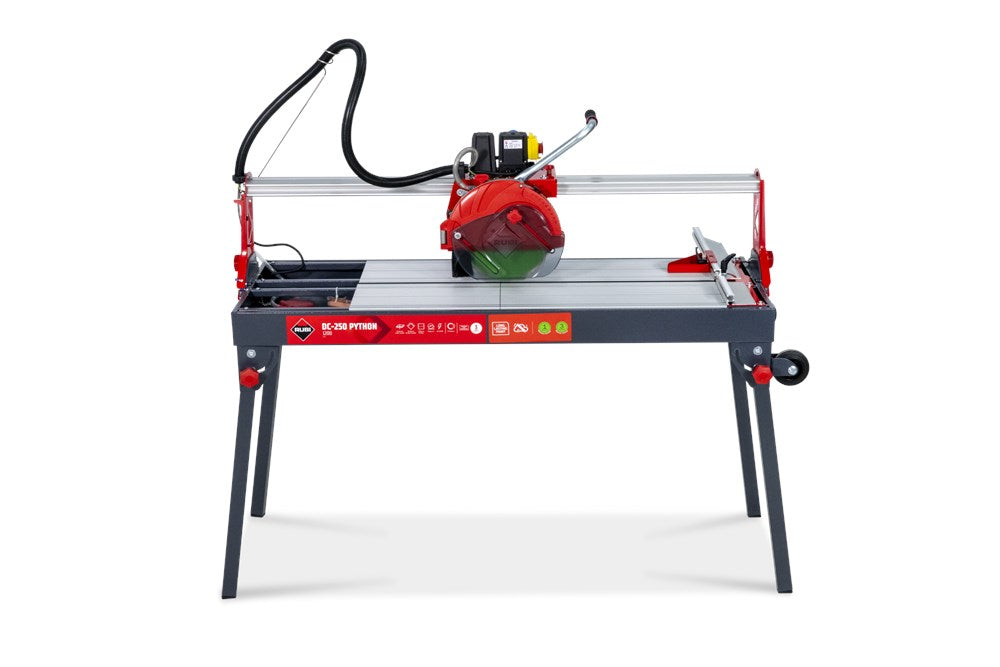 De serie DC-250 PYTHON zaagmachines van RUBI bestaat uit uiterst precieze verstelbare zaagkopmachines die de professionele tegelzetter maximale functionaliteit en betrouwbaarheid bieden.De DC-250 PYTHON is een optimale professionele oplossing voor het zagen van  natuursteen en keramiek: een verbeterde versie van één van onze klassiekers. Verkrijgbaar in twee modellen: 850 en 1200, met maximale zaagengtes van respectievelijk 98 en 121 cm.Motor gemonteerd op kogellagers voor maximale precisie en betrouwbaarheid. Kantelbaar in 45° voor perfecte verstekken. Direct aangedreven motor.Het C3 Python-systeem zorgt voor een efficiëntere koeling en reiniging van het blad, waardoor de prestaties en de levensduur van het blad worden verlengd en de nauwkeurigheid van het zagen wordt verbeterd, terwijl het spatten wordt verminderd.De vooraanslag is met slechts één enkele schroef zeer nauwkeurig af te stellen op 90 graden indien gewenst. Inklapbare poten met wielen voor een gemakkelijker transport en uitneembare binnentafels voor een gemakkelijke reiniging van de machine.De DC-250 PYTHON bevat een diamantschijf model CEV-SUPERPRO ø250; met uitzondering van referentienummer 56949 die de CPA SUPERPRO ø250 schijf heeft.Het zaagblad met doorlopende kroon zorgt voor zagen met optimale resultaten. Dankzij de beschermkap is de DC-250 PYTHON ook compatibel met de TURBO en gesegmenteerde zaagbladen.Deze zaagmachine heeft ook het gepatenteerde ZERO DUST-systeem, exclusief voor RUBI, en gecertificeerd door TNO*, voor een veilige blootstelling dankzij de vermindering van de inhaleerbare stofdeeltjes die tijdens het zagen ontstaan. *Het ZERO DUST systeem biedt "veilige blootstellings"-waarden aan inadembare kwartsstofdeeltjes binnen de "door de gebruiker in te ademen zone", waardoor de RUBI elektrische zaagmachines tot 3 uur non-stop veilig keramische platen kunnen zagen en 1 uur lang natuursteen kunnen zagen.Het grote werkgebied (100 x 48,5 cm) is ideaal voor het werken met keramische tegels van groot formaat en de werkhoogte van 84,5 cm biedt de professional een betere ergonomie.Bij RUBI bekommeren wij ons altijd om de gezondheid van de professional. Het concept ergonomie is altijd sterk aanwezig in het ontwerp van onze apparaten, omdat wij van mening zijn dat veiligheid en het minimaliseren van het risico op letsel op het werk van fundamenteel belang zijn voor een gezonde en correcte uitvoering.