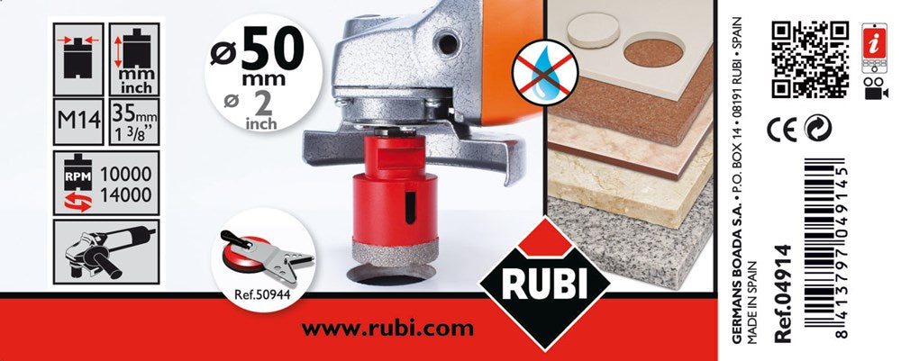 De DRYGRES serie van de diamantboren zijn aanbevolen voor het boren van alle soorten tegels en andere wand of vloermaterialen zoals marmer en graniet.In de DRYGRES serie van de diamantboren heeft RUBI vacuüm gesoldeerde technologie gebruikt, die de weerstand tegen temperatuur en wrijving verhoogt, om zo de levensduur van de diamantboor te verhogen.DRYGRES boren in de diameters 6-12 mm zijn perfect voor het installeren van badkameraccessoires. Andere diameters in de DRYGRES diamant serie 20-75 mm zijn bedoeld om de beste resultaten te krijgen bij het uitvoeren van de noodzakelijke boren voor waterleidingen, waterafvoer, elektrische aansluitingen, enz.DRYGRES diamantboren zijn gemaakt om droog mee te boren en kan worden gebruikt via M14 draadverbinding op een slijpmachine of door middel van een booradapter (ref. 05.976) op een boormachine.De gemiddelde levensduur van de DRYGRES boren is afhankelijk van de diameter. In diameters van 6-12 mm is de gemiddelde levensverwachting is 25 gaten en de DRYGRES 20-75 mm heeft een gemiddelde levensduur is 60 gaten.De gemiddelde levensduur van de boren is altijd afhankelijk van het soort materiaal, de dikte, een goede koeling en de toepassing.De boordiepte van DRYGRES boren is 36 mm.De diameters van 6, 8, 10 en 12 mm van de DRYGRES boren bevatten was binnen. Dit was smelt tijdens het boren en dit bevorderd de koeling en de afvoer van boorresten bij de boorkop. Als de was op is dan kan de boor gewoon gebruikt worden. Alleen slijtage aan het diamant op de boorkop kan bepalen wanneer de boor versleten is.De DRYGRES boren (diameter 20-75 mm) hebben een zijopening die de koeling van de boor verbetert en dit zorgt er ook voor dat de resten na het boren makkelijker verwijderd kunnen worden uit de boor. Voordat de boor nogmaals gebruikt gaat worden moeten alle resten uit de boorkop verwijderd zijn.De maximumsnelheid voor het gebruik van DRYGRES diamantboren is 14.000 rpmVoor een betere afwerking en langere duur van de boor, is het belangrijk om de geadviseerde rotatiesnelheid aan te houden en om met de boor een draaiende beweging te maken tijdens het boren.