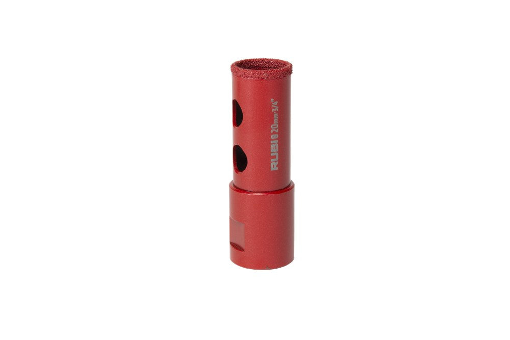 De DRYGRES PREMIUM reeks diamantboren is perfect voor het boren van alle soorten tegels, vooral porcellanato, en andere steenachtige soorten zoals marmer en graniet.RUBI heeft de VACUUM BRAZED-technologie van vacuüm solderen gebruikt in de DRYGRES PREMIUM reeksboren, die hogere temperaturen door wrijving te weerstaan. Hierdoor ontstaat een hogere standtijd van de diamantboren.DRYGRES PREMIUM diamantboren, met diameters Ø 6 tot 12 mm, zijn perfect voor het bevestigen van badkameraccessoires of elk type decoratie-accessoire op betegelde oppervlakken. De overige diameters van het DRYGRES PREMIUM diamantborenassortiment, van Ø 20 tot 85 mm, zijn vooral ontworpen om de tegelzetter de beste resultaten te bieden bij het boren van stopcontacten, buizen, afvoeren, verlichting, enz.DRYGRES PREMIUM diamantboren zijn droog geslepen en kunnen dankzij hun M14 schroefdraadaansluiting rechtstreeks op een haakse slijper of via een adapter (ref. 05976) op een boormachine – zonder klopfunctie – gebruikt worden.De gemiddelde levensduur van de DRYGRES PREMIUM diamantboren varieert naargelang de diameter: die van Ø 6 tot 12 mm hebben een gemiddelde levensduur van 60 gaten en voor de boren van Ø 20 tot 85 mm is dat 150 gaten.De gemiddelde levensduur van de boren hangt ALTIJD af van het soort materiaal, de dikte en de juiste koeling en gebruik.De boordiepte van de DRYGRES PREMIUM diamantboren bedraagt 30 mm voor boren van Ø 6 tot 35 mm en 38 mm voor boren van Ø 43 tot 85 mm.In de diameters Ø 6, 8, 10 en 12 mm bevatten de PREMIUM DRYGRES binnenin wax. Deze wax smelt tijdens het gebruik van de boor en vergemakkelijkt het afkoelen en evacueren van het boorgruis (Als de wax opraakt, kan de boor gewoon verder gebruikt worden. Slechts het totale verlies van de diamant geeft het einde van de levensduur van de boor aan).De DRYGRES PREMIUM diamantboren (diameters Ø 20 tot 85 mm) hebben een zijdelingse opening die de afkoeling van de boor verbetert en het ons gemakkelijker maakt om na elk boorgat de boorkern te verwijderen. Alvorens een nieuw gat te boren, moeten we er zeker van zijn dat de boor schoon is. Boren vanaf Ø 43 mm zijn gesegmenteerd om de stabiliteit tijdens het boren te verbeteren.De maximale gebruikssnelheid voor DRYGRES PREMIUM diamantboren is 14.000 rpm.Voor een betere afwerking en een langere levensduur van de boor is het belangrijk om het juiste toerental te respecteren en een licht pendelende beweging te maken tijdens het boren.
