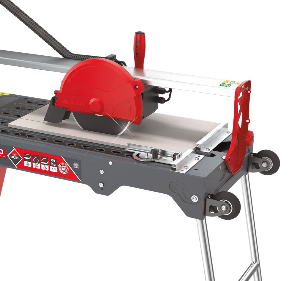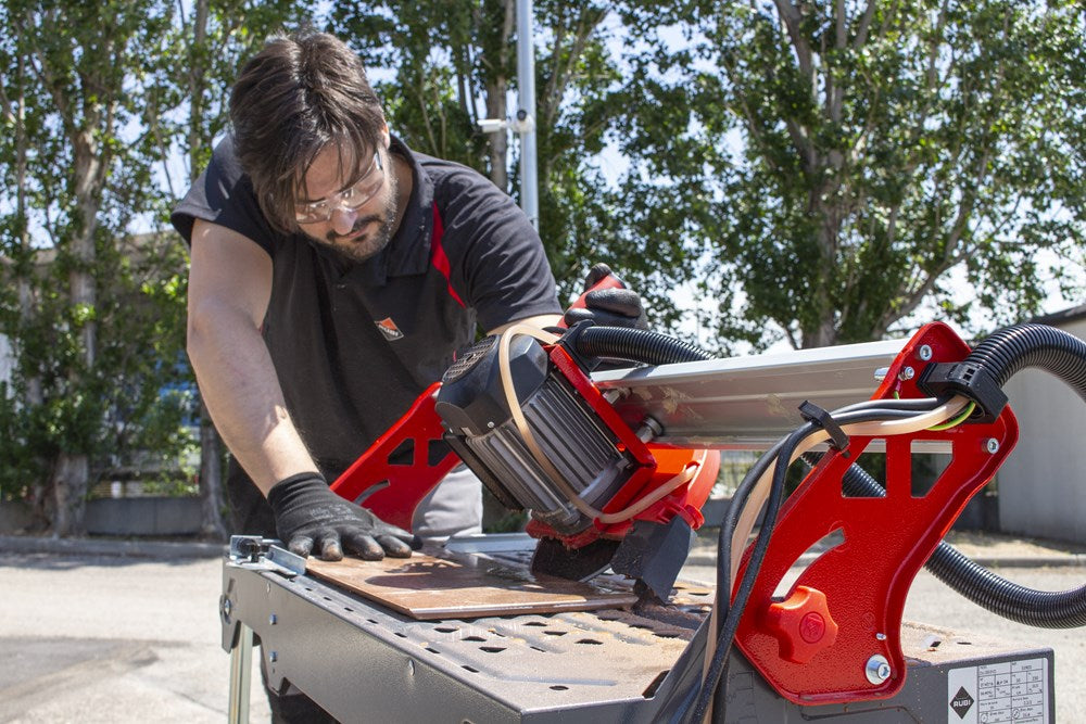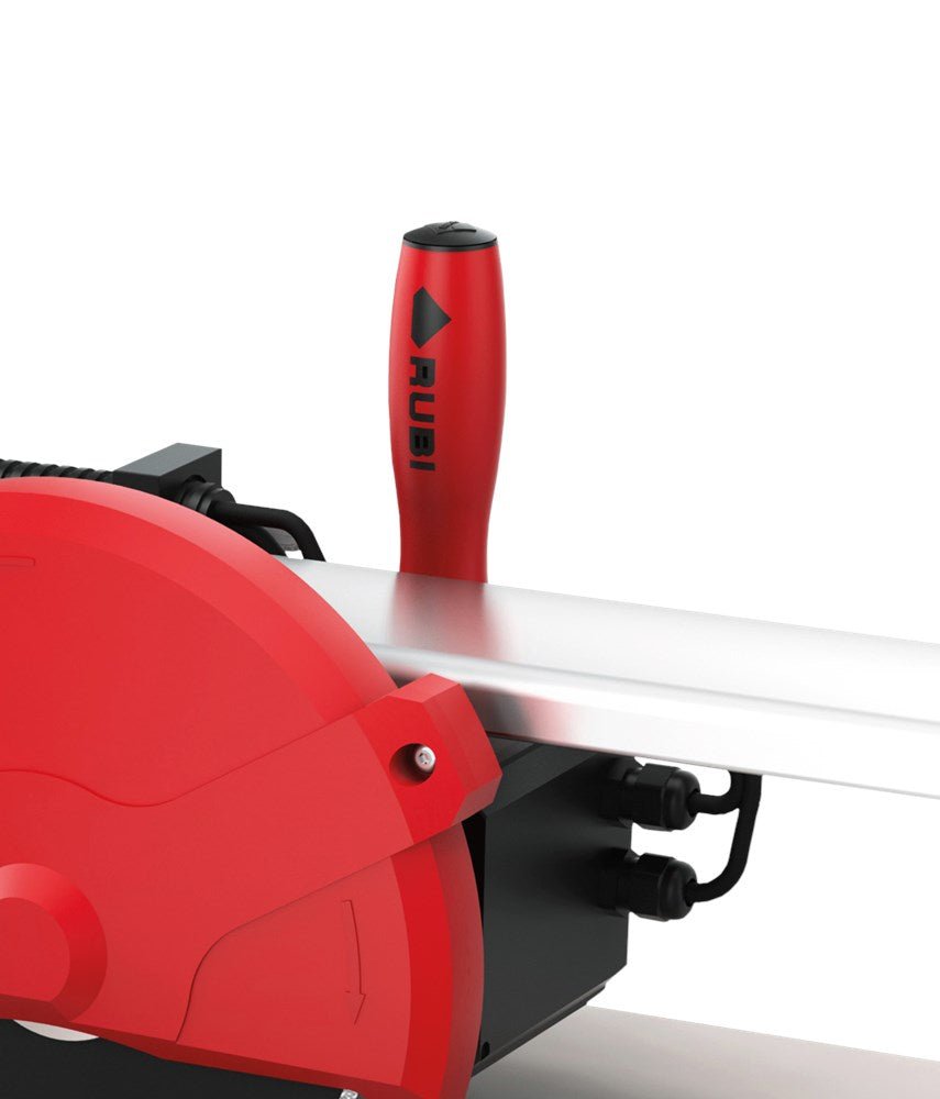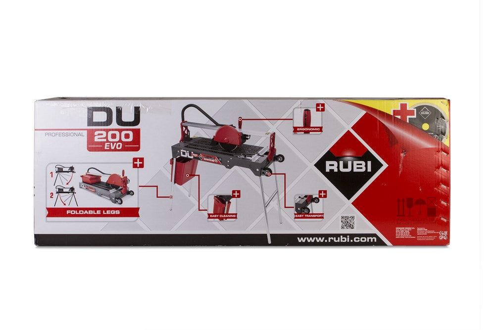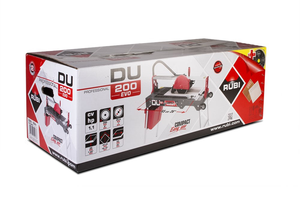 De RUBI DU-EVO is een elektrische zaagmachine met een mobiele zaagkop, ontworpen voor renovaties en licht werk.Het is perfect voor het zagen van algemene keramische tegels en dun of zacht natuursteen. De DU-EVO elektrische zaagmachine is met name geschikt voor het zagen van vloertegels (BIII) en geglazuurde wandtegels (BIIa type).De RUBI DU-EVO elektrische zaagmachine is uitgerust met een 1,1 PK (0,8 kW) direct aangedreven motor met thermische beveiliging.De zaagkop van de DU-EVO RUBI elektrische zaagmachine rolt over 4 lagers en scharniert op 45º om verstek zagen uit te kunnen voeren. De machine is ook uitgerust met een bi-materiaal handgreep om de gebruiker meer ergonomisch comfort te geven.De DU-EVO RUBI elektrische zaagmachine is voorzien van een 200 mm diamantzaagblad met doorlopende ring, standaard voor het algemene zagen van keramische tegels. (CEV-PRO type). De DU-EVO zaagmachines zijn uitgerust met het exclusieve C3 SYSTEEM van RUBI, een systeem dat het mogelijk maakt de koeling en de reiniging van het blad aan te passen aan de behoeften van de gebruiker, wat de prestaties van het diamantschijf aanzienlijk verbetert. Een 8 W waterpomp koelt het blad met een watertoevoerklep om de koeling voor elk soort keramisch materiaal aan te passen.Het innovatieve ontwerp van het chassis is voorzien van een efficiënt water opvangsysteem, zodat u minimaal 50% meer kunt zagen met dezelfde hoeveelheid water. De 8 liter tank is gemakkelijk uitneembaar, zowel voor het vullen als voor het reinigen en het transport.De RUBI DU-EVO zaagmachines hebben ook een systeem van opklapbare poten die, naast een grotere stabiliteit van het gereedschap, de professional een werkhoogte van 90 cm biedt. De in het chassis geïntegreerde wielen en handgreep vergemakkelijken de handling en het transport van de DU-EVO modellen aanzienlijk.Alle modellen in de DU-EVO serie zijn standaard voorzien van een aluminium vooraanslag, in millimeters, en een verstelbare zijaanslag voor repetitieve sneden en hoeksneden, van 0º tot 45º.Het merk RUBI staat bekend om de duurzaamheid en kwaliteit van haar gereedschappen. Al meer dan 65 jaar produceert RUBI alleen producten met een hoge duurzaamheid en weerstand, om de beste prestaties te leveren in de zwaarste werkomstandigheden en zich aan te passen aan de eisen van elke markt.