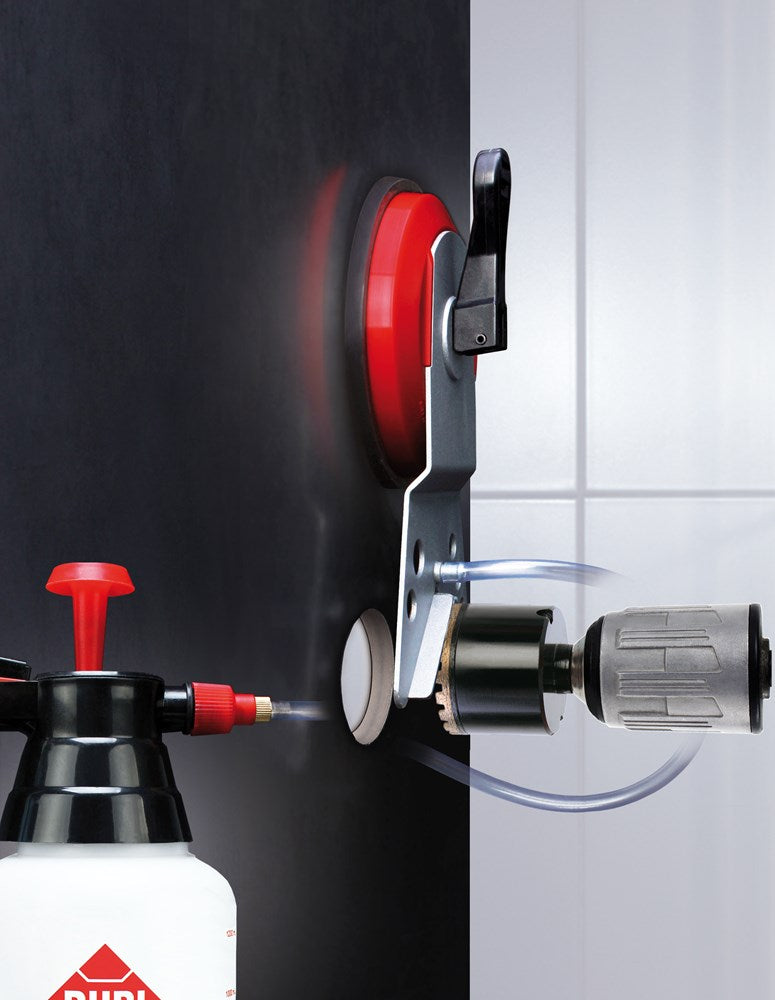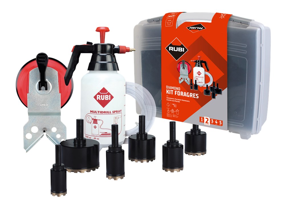 De FORAGRES diamantboren set is aanbevolen voor het boren van alle soorten tegels en andere wand of vloermaterialen zoals marmer en graniet.De FORAGRES diamantboren set bestaat uit: een MULTIDRILLgeleider, een 1,2 liter watertank en een handwaterpomp, een 2 m waterslang, Diamantboren van 20, 28, 35, 43, 50, 68 mm diameter en een koffer .De diamant rand van FORAGRES boren is aan de metalenboor bevestigd door een verstevigde las.De FORAGRES diamantboren moeten altijd worden gekoeld met water en kan alleen aangesloten worden op een boormachine.Het gebruik van de MULTIDRILL geleider (ref. 50944) wordt aanbevolen tot een diameter van 83 mm. Voor het boren van gaten van meer dan 84 mm in diameter, wordt de FORAGRES geleider aanbevolen (ref. 50900).De gemiddelde levensduur van de FORAGRES diamantboorbits is 60 gaten en is altijd afhankelijk van het soort materiaal, de dikte en goede koeling en toepassing.De gemiddelde levensduur van de FORAGRES diamantboren is 60 gaten en is altijd afhankelijk van het soort materiaal, de dikte, de koeling en de toepassing.De boordiepte van de FORAGRES diamantboren is 30 mm (33 mm voor diameters van 55 en 75 mm).De maximumsnelheid voor het gebruik van FORAGRES diamantboren is 900 rpm, behalve bij diameters van 100 en 120 mm, waar de maximumsnelheid is 450 rpm is.Voor een betere afwerking en langere levensduur boor, is het belangrijk om de juiste rotatiesnelheid aan te houden en matige druk uit te oefenen tijdens het boren.