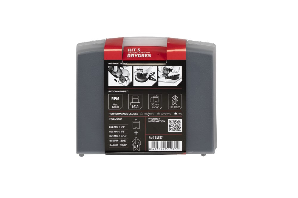 KIT DRYGRES PREMIUM diamantboren zijn de meest economische oplossing voor gebruikers die gaten van verschillende diameters moeten droogboren in alle soorten tegels.Het DRYGRES PREMIUM assortiment diamantboren wordt aanbevolen voor het boren in alle soorten keramische tegels, met name porseleinen tegels, en andere wand- of vloertegels zoals marmer en graniet.In de DRYGRES PREMIUM serie heeft RUBI de VACUUM BRAZED vacuümsoldeertechnologie gebruikt, die de weerstand tegen hoge temperaturen en wrijving verhoogt, door de diamantdeeltjes in het boorgedeelte vast te zetten.De KIT DRYGRES PREMIUM diamantboren is voornamelijk ontworpen om de tegelzetter de beste resultaten te geven bij het boren van de diverse gaten voor waterleidingen, waterafvoer, elektrische aansluitingen, enz.De DRYGRES PREMIUM kits bestaan uit: - MULTIDRILL geleider - 28, 35, 43 en 68 mm diamantboren (ref. 51931) - 28, 35, 43, 50 en 68 mm diamantboren (ref. 51937) - 6, 8, 20, 35, 50 en 68 mm diamantboren (ref. 51929) - KofferDRYGRES PREMIUM diamantboren zijn gemaakt om droog mee te boren en kunnen, dankzij hun M14 schroefdraadaansluiting, rechtstreeks op een haakse slijper gebruikt worden of op een boormachine, via de booradapter (ref. 05976). De gemiddelde levensduur van de DRYGRES PREMIUM diamantboren Ø 20 tot 85 mm bedraagt 150 gaten. De gemiddelde levensduur van de boren hangt ALTIJD af van het soort materiaal, de dikte ervan, de juiste koeling en het juiste gebruik.De boordiepte van DRYGRES PREMIUM diamantboren bedraagt 30 mm voor de diameters van Ø 6 tot 35 mm en 38 mm voor de diameters van Ø 43 tot 85 mm.DRYGRES PREMIUM diamantboren (diameters Ø 20 tot 85 mm) hebben een zijdelingse opening die de koeling van de boor verbetert en het gemakkelijker maakt om de afvoer van boorresten na elke boring te verwijderen. Voordat de boor nogmaals gebruikt gaat worden moeten alle resten uit de boorkop verwijderd zijn. De modellen met Ø 43 tot 85 mm diameter zijn gesegmenteerd om een grotere stabiliteit te bieden tijdens het boren.De maximumsnelheid voor het gebruik van DRYGRES PREMIUM diamantboren is 14.000 rpm.Voor een betere afwerking en langere duur van de boor, is het belangrijk om de geadviseerde rotatiesnelheid aan te houden en om met de boor een pendelende beweging te maken tijdens het boren.