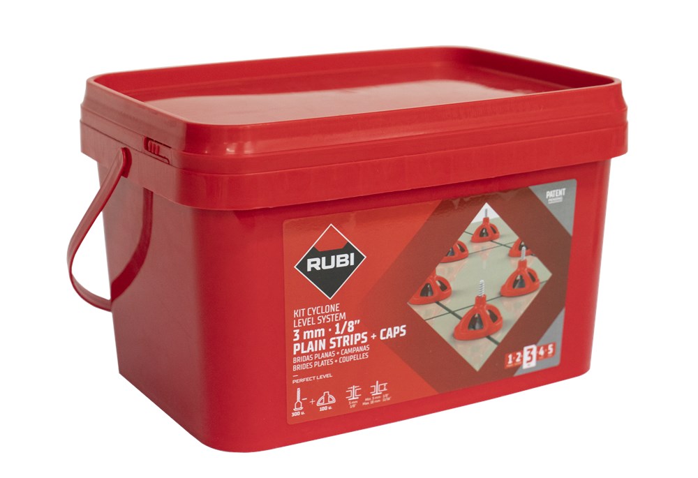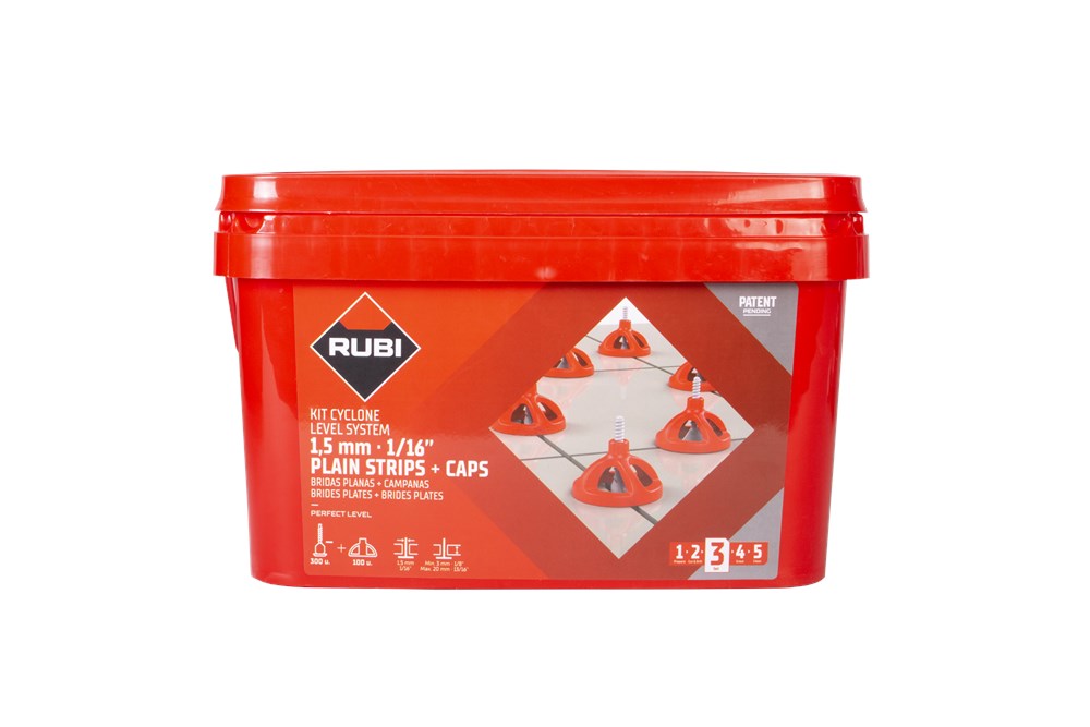 De belangrijkste functie van het CYCLONE LEVEL SYSTEEM is het voorkomen van onregelmatigheden tijdens het leggen van keramische tegels, zowel op vloeren als op wanden.De RUBI levelsystemen worden vooral aanbevolen bij het werken met grootformaat tegels. Hoewel ze ook met kleinere formaten kunnen worden gebruikt (aanbevolen vanaf 30x30 cm). Altijd met de dubbele verlijming techniek (buttering floating) en op een vlakke ondergrond.Het gebruik van het CYCLONE LEVEL SYSTEEM van RUBI, is zeer eenvoudig en intuïtief. Bovendien zijn de resultaten minder gevoelig voor de vaardigheid en ervaring van de gebruiker dan bij de andere levelsystemen op de markt.Het assortiment strips van het CYCLONE LEVEL SYSTEEM heeft verschillende diktes en bestaat uit vlakke strips, t-strips en kruisstrips. De kruis- en t-strips zijn op de hoeken van de tegel te gebruiken en kunnen ook als vervanging* van de traditionele tegelvoegkruisjes ingezet worden. Elke voegbreedte is gemakkelijk te identificeren dankzij de verschillende kleuren.De kapjes zijn herbruikbaar. De grote ronde basis zorgt voor een gelijkmatige druk op elk moment. Het ontwerp van de CYCLONE LEVEL SYSTEEM kapjes is speciaal bedacht om de ergonomie te maximaliseren tijdens het handmatig aanspannen (voor het CYCLONE LEVEL SYSTEEM is geen extra gereedschap nodig, niet voor het aanspannen, en ook niet voor het verwijderen) en voor de hoogst mogelijke zichtbaarheid binnen in het kapje zelf (om bijvoorbeeld te kunnen zien of er te veel lijm gebruikt is).Het verwijderen van het CYCLONE LEVEL SYSTEEM gebeurt door middel van een impulsbeweging (met de voet of een hamer) en, zoals we al eerder gezegd hebben, je hebt er geen extra gereedschap voor nodig.*Alleen de kruis- en t-strips zijn vervangers voor tegelvoegkruisjes.