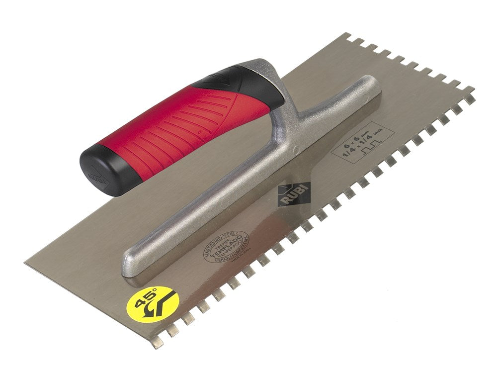 Dit RUBI troffel en spaan assortiment omvat een innovatieve lijmkam, met een hoek van 45 ° graden voor meer comfort en minder inspanning.De troffels en gekerfd troffels met de RUBIFLEX gesloten 45º verbeteren het verwerken van de hechting van de lijm van keramische tegels op het werkoppervlak.De troffels en gekerfd troffels met gesloten RUBIFLEX houten handgrepen hebben een speciale hoge slijtvaste stalen plaat en corrosiebescherming met kleurloze lak.(STAAL).Een van de kenmerken van alle RUBI troffels en inkeping troffels is de perfecte vlakheid van de plaat.De versterking en de plaat zijn zeer vast bevestigd door middel van bouten druk die eenmaal gemonteerd zijn onmogelijk te verwijderen zonder dat de unitaire karakter van het gereedschap.De troffels en gekerfd troffels met open RUBIFLEX handgrepen hebben een speciale hoge slijtvaste stalen plaat en corrosiebescherming met kleurloze lak. (STAAL).Een van de kenmerken van alle RUBI troffels en gekerfd troffels is de perfecte vlakheid van de plaat.Alle modellen van troffels en gekerfd troffels in deze reeks hebben de exclusieve RUBIFLEX ergonomische handgreep met twee texturen. Een zeer ergonomisch handgreep met een verhoogde grip.De versterking en de plaat zijn zeer vast bevestigd door middel van drukbouten die eenmaal gemonteerd zijn onmogelijk te verwijderen zonder dat het effect heeft op de unitaire karakter van het gereedschap.Bij de toepassing van lijmen voor montage keramische tegels, de open en hardingstijden van elke fabrikant moet altijd rekening worden gehouden.Troffel en lijmkam modellen met open handgrepen vergemakkelijken controle bij het aanbrengen van materiaal. Een van de voordelen die professionele tegelzetter vinden aan dit type handgreep, dankzij zijn opening, kan het gereedschap worden opgehangen aan de rand van de bak, kuip of een andere voorwerp waarin het aan te brengen materiaal zit. Hiermee kunt u de troffel of lijmkam ten allen tijde handig en schoon houden.Dit scala aan accessoires, zoals de andere assortimenten in onze catalogus is ontworpen om gebruikers tijdswinst te bieden en de efficiëntie te verhogen in hun werk. Bij RUBI zijn we ons bewust van het belang van vandaag van de efficiëntie en tijdsbesparing, dus ons product development managers zijn erg gericht op deze concepten bij het ontwerpen van nieuwe gereedschappen