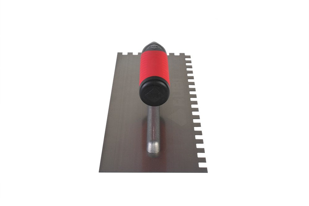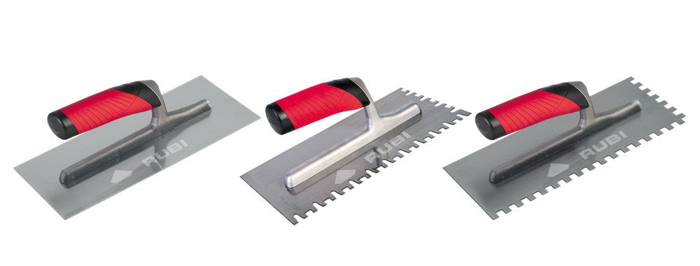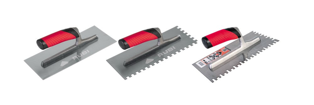 De troffels en gekerfd troffels met open RUBIFLEX handgrepen hebben een extreem lichtgewicht en aluminium versterking.De versterking en de plaat zijn zeer vast bevestigd door middel van drukbouten die eenmaal gemonteerd zijn onmogelijk te verwijderen zonder dat het effect heeft op de unitaire karakter van het gereedschap.De troffels en gekerfd troffels met open RUBIFLEX handgrepen hebben een speciale hoge slijtvaste stalen plaat en corrosiebescherming met kleurloze lak. (STAAL).Er zijn ook modellen met een speciale hoge slijtvaste roestvrij stalen plaat.Een van de kenmerken van alle RUBI troffels en inkeping troffels is de perfecte vlakheid van de plaat.Alle modellen van troffels en gekerfd troffels in deze reeks hebben de exclusieve RUBIFLEX ergonomische handgreep met twee texturen. Een zeer ergonomisch handgreep met een verhoogde grip.Troffel en lijmkam modellen met open handgrepen vergemakkelijken controle bij het aanbrengen van materiaal. Een van de voordelen die professionele tegelzetter vinden aan dit type handgreep, dankzij zijn opening, kan het gereedschap worden opgehangen aan de rand van de bak, kuip of een andere voorwerp waarin het aan te brengen materiaal zit. Hiermeekunt u de troffel of lijmkam ten allen tijde handig en schoon houden.Een ander aspect dat het RUBI assortiment troffels en lijmkammen onderscheid van de rest is het brede scala van modellen en afmetingen van de inkepingen.Bij de toepassing van lijmen voor de montage van keramische tegels, moet er altijd rekening gehouden worden met de open en hardingstijden van elke fabrikant.Daarnaast, als onderdeel van de strategie, wordt bij RUBI continu onderzoek gedaan op basis van de evolutie van de gereedschappen en op basis van de eisen van de door toonaangevende keramische tegel fabrikantenwereldwijd, 30.000 RUBI dealers en meer dan 40.000 eindgebruikers die geregistreerd zijn bij de RUBI club. Als gevolg van al deze factoren, biedt RUBI professionele tegelzetters de meest uitgebreide en geschikt bereik van tools op de markt. Alles wat je nodig hebt voor alle fasen van de verwerking van keramische tegels.