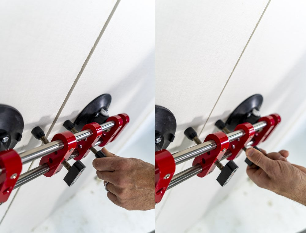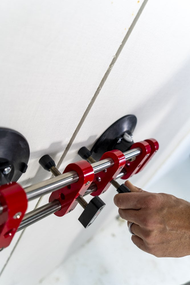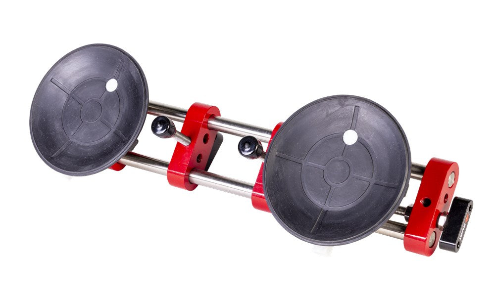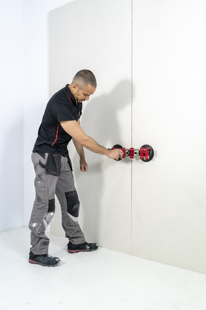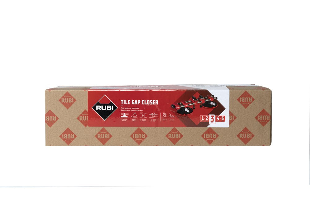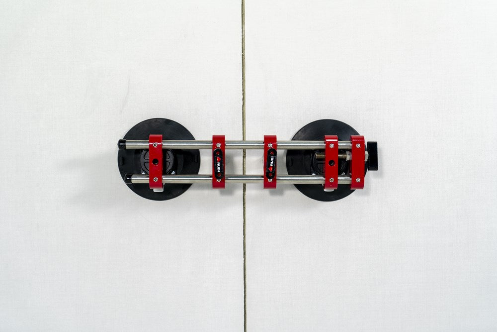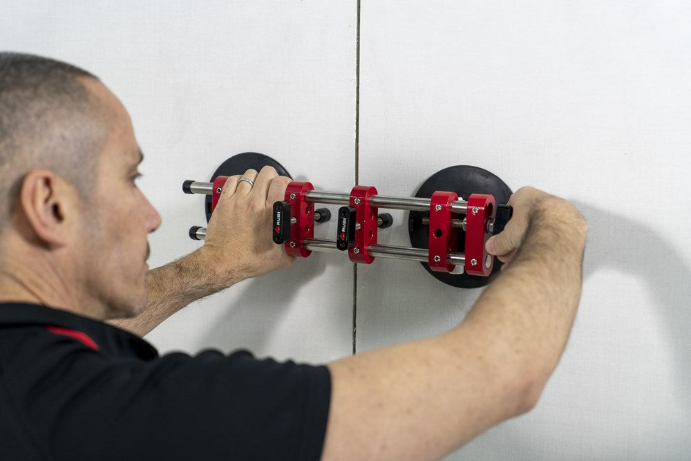 Met de RUBI nivelleercorrector kan de professionele tegelzetter snel en nauwkeurig de tegelvoeg aanpassen. De nivelleercorrector is speciaal ontworpen voor het werken met slabs en grootformaat tegels. Deze materialen met een groot oppervlak zijn zeer moeilijk aan te passen als ze eenmaal zijn gelegd. De kracht van de dubbele verlijming genereert veel weerstand en de gebruiker moet grote krachtsinspanningen leveren en loopt het risico het materiaal te beschadigen.Om dit proces te vergemakkelijken, voorziet RUBI de professional van de nivelleercorrector. Uitgerust met twee vacuümzuignappen met een diameter van 150 mm en geschikt voor een grote verscheidenheid aan oppervlakteafwerkingen.De regelaar wordt bevestigd op twee verschillende tegels: de laatst geplaatste en die daarvoor. Zodra de zuignappen op beide tegels vastzitten, kan de breedte van de tegelvoeg worden ingesteld van 0 tot maximaal 40 mm.Met de tegelregelaar kun je ook het horizontale niveau van de tegels instellen in een bereik van 0 tot 20 mm. Het maximale hefvermogen is 100 kg.De nivelleercorrector vervangt in geen geval het gebruik van tegelkruisjes of nivelleersystemen, aangezien dit werktuig zo is ontworpen dat kleine aanpassingen die, bij tegels van kleinere formaten, met de hand zouden worden uitgevoerd, gemakkelijk en snel en met de minste inspanning voor de professionele tegelzetter kunnen worden uitgevoerd.Bij het werken met zeer grote formaten is het altijd raadzaam twee nivelleercorrectoren te gebruiken. Op die manier wordt een veel snellere en preciezere afstelling van de geïnstalleerde tegel verkregen.
