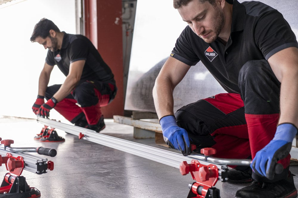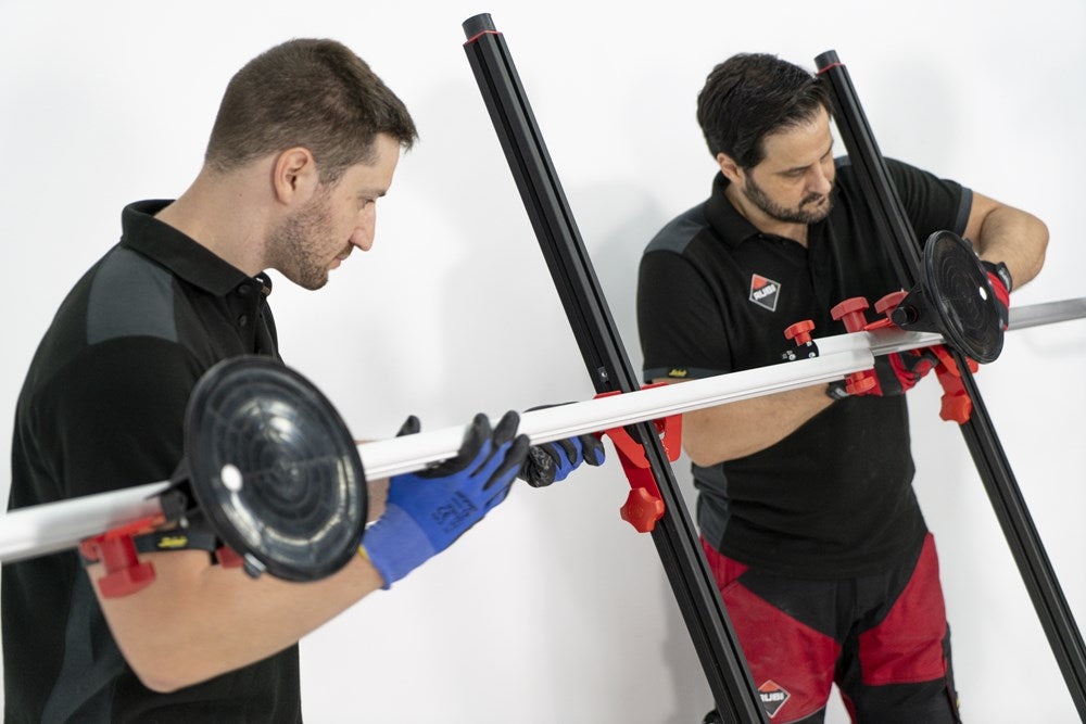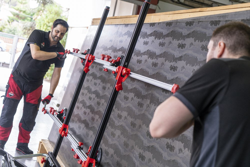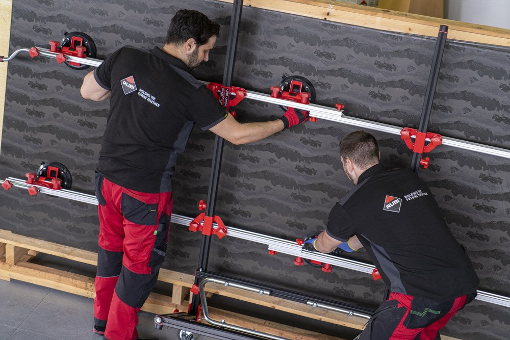 Het SLIM EASY TRANS PLUS transportsysteem is ontworpen voor de handling van platen met een maximale dikte van 6 mm. Dankzij het systeem van inschuifbare versterkte aluminiumprofielen kan de SLIM EASY TRANS PLUS keramische platen tot een maximale lengte van 320 cm verwerken. Deze intrekbare profielen kunnen in lengte worden versteld van 170 cm tot maximaal 320 cm.De handgrepen, die ook verstelbaar zijn, zijn voorzien van soft-grip handgrepen voor meer ergonomie en comfort tijdens het hanteren. De handgrepen van de SLIM EASY TRANS PLUS glijden door de bovenste gleuf van de intrekbare geleiders, wat de opslag en het transport van het hele systeem vergemakkelijkt.Het transportvermogen van de SLIM EASY TRANS PLUS is 80 kg, maar als de DWARSBALKENSET (ref. 18819) wordt toegevoegd, neemt het draagvermogen toe tot maximaal 120 kg. Met behulp van de DWARSBALKENSET (ref. 18819) op de SLIM EASY TRANS PLUS, wordt het systeem ook compatibel gemaakt met de SLAB TROLLEY (ref. 18934).De SLIM EASY TRANS PLUS is voorzien van 6 vacuümzuignappen met een diameter van 20 cm en een hoog draag- en vasthoudvermogen. De zuignappen kunnen worden verschoven en hun positie kan worden aangepast aan het formaat van de plaat. De vacuüm pad zorgt voor extra veiligheid en betrouwbaarheid bij het vastzetten van het materiaal. OPMERKING: Het toevoegen van meer zuignappen verhoogt het maximale draagvermogen van de SLIM EASY TRANS PLUS niet. De zuignappen van de SLIM EASY TRANS PLUS zijn niet compatibel met de SLIM EASY TRANS (ref. 18910), en omgekeerd zijn de zuignappen van de SLIM EASY TRANS PLUS ook niet compatibel met de SLIM EASY TRANS PLUS.RUBI beveelt het gebruik van de TROLLEY en individuele veiligheidselementen aan bij het hanteren van zware lasten. De hantering van deze materialen moet worden uitgevoerd door het aantal personen dat nodig is volgens de waarden voor de maximale belasting van één persoon.