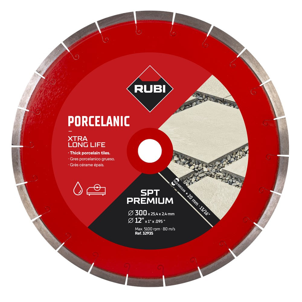 Het SPT PREMIUM assortiment diamantzaagbladen is speciaal ontworpen voor het zagen van porcellanato tegels met een dikte van meer dan 20 mm (dunnere tegels gaan natuurlijk altijd).Het lasergelaste zaagblad is samengesteld met langwerpige segmenten gevolgd door vele smalle openingen, zodat het water voor de koeling gemakkelijker de diepte mee ingenomen kan worden. Deze segmenten zorgen zowel voor een zeer hoge zaagsnelheid alsook voor een hele nauwkeurig en mooi afgewerkte zaagsnede.Door de speciale binding en de juiste variaties diamant blijft dit blad extreem lang scherp. Hierdoor is dit blad dé oplossing voor het nat zagen van dikkere tegels tot 35 mm, afhankelijk van de diameter van het blad en het vermogen van de motor.Alle bladen van de RUBI SPT PREMIUM serie zijn geschikt voor gebruik op machines met een beveiligingssysteem volgens de normen voor het gebruik van gesegmenteerde bladen.Rekening houdend met de bijzonderheden van elk type zaagblad (doorlopend, turbo, enz.) en met de materialen waarvoor deze is ontworpen, biedt RUBI bladen in drie verschillende kwaliteiten: PRO, SUPERPRO en PREMIUM.